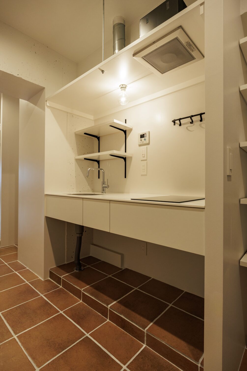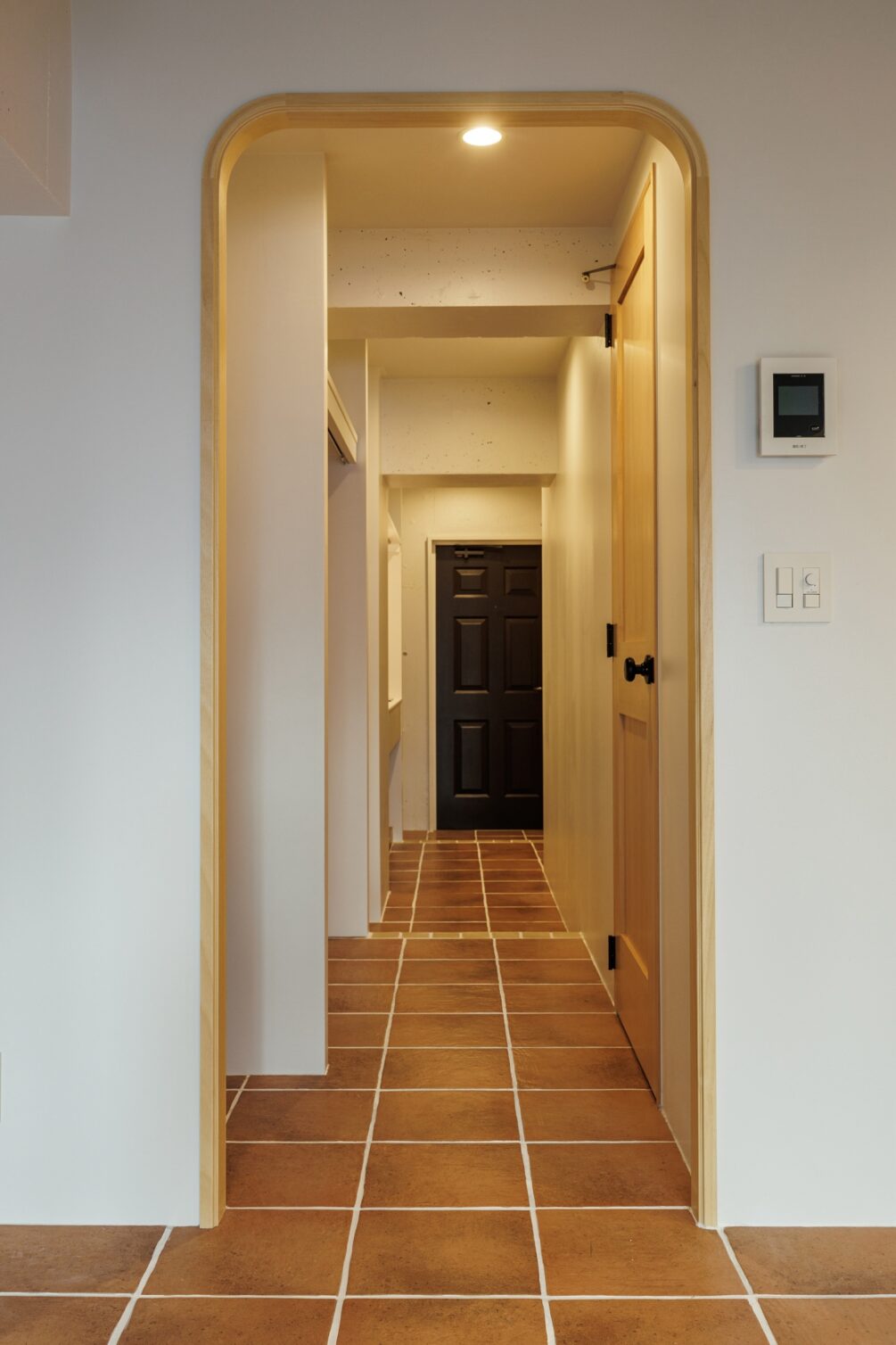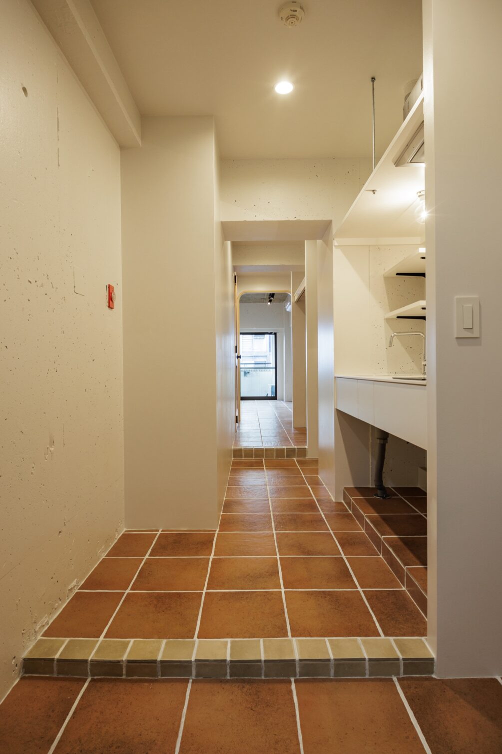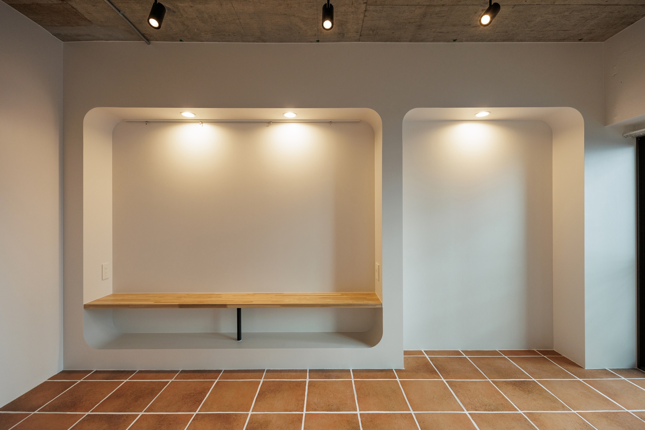 東京メトロ半蔵門線「半蔵門」駅から徒歩わずか2分。麹町や皇居のあるビジネス街。飲食店も豊富な街並みはいわゆる「東京」を体感できる街。そんな半蔵門の街に、リノベーションシリーズ「Boho」の部屋があります。自分だけのためのギャラリースペースのような、洗練されたアーティスティックな空間に仕上がりました。テラコッタ調の磁気タイルが敷き詰められた2面採光の居室には、壁を彫り込んだディスプレイシェルフを2種類のサイズで造りました。それぞれのシェルフに、お気に入りのアイテムやアートを並べて楽しむことができます。収納は廊下部分にワイドのあるオープンクローゼットと可動棚を設置。部屋の中央となる場所に収納を置くことで、水回りと合わせて自分を整えるスペースとして生活動線をまとめています。収納だけでなくキッチンも玄関側に設置することで、より居室を『表現する場所』として位置付けています。毎日自分の好きなものに囲まれて、今日もいい部屋だなと思いながら過ごす、そんな時間が送れそうです。
