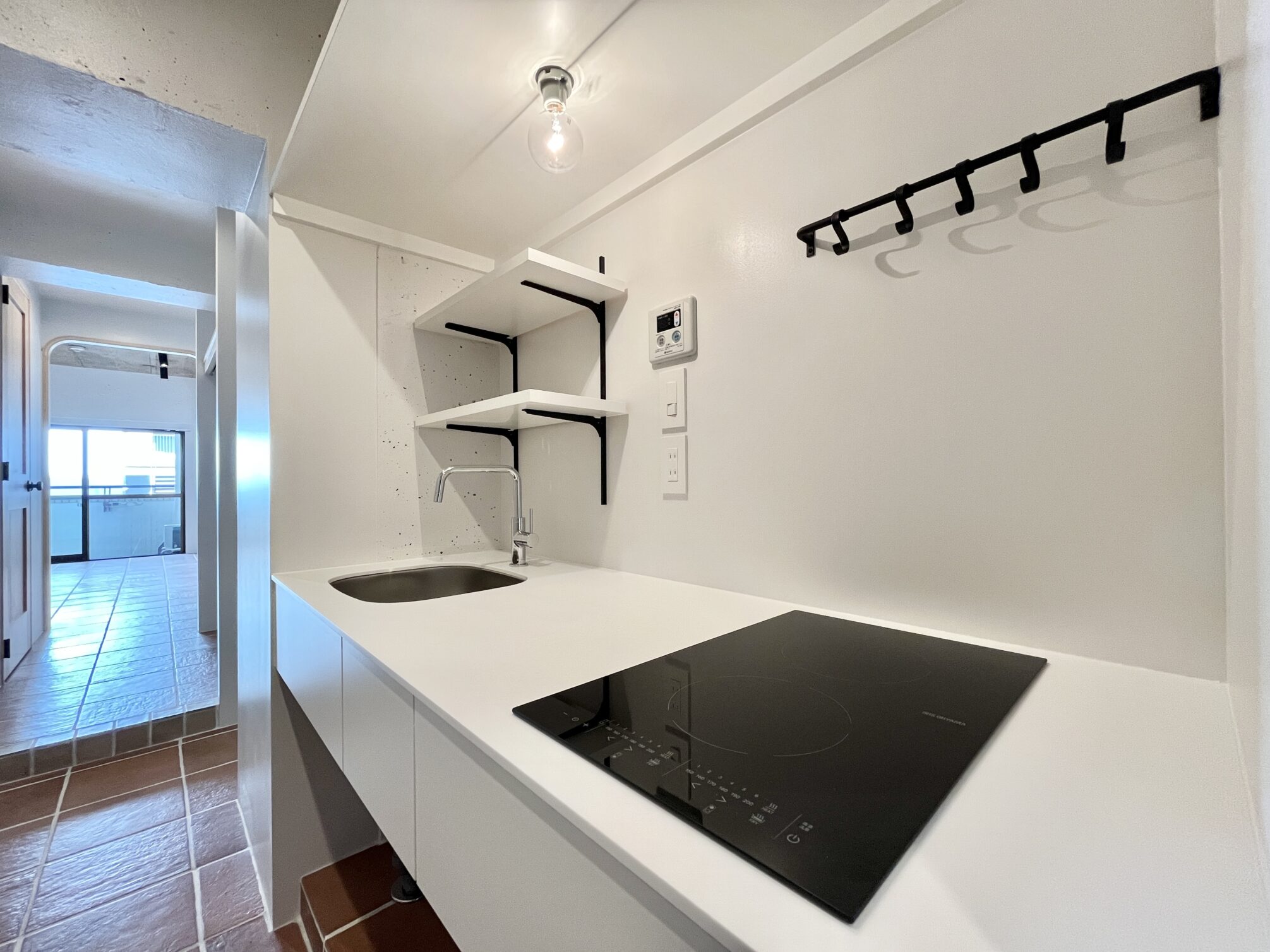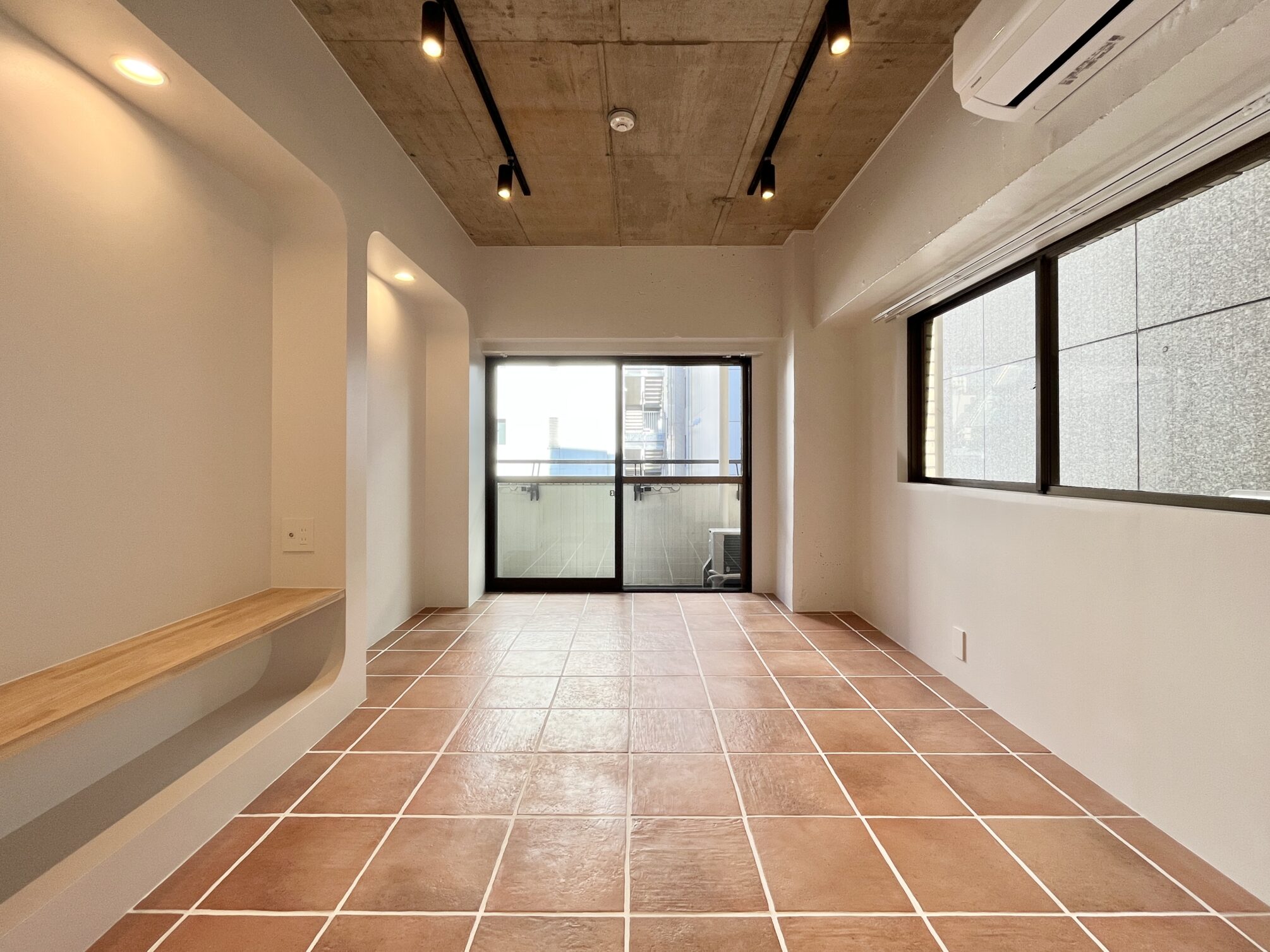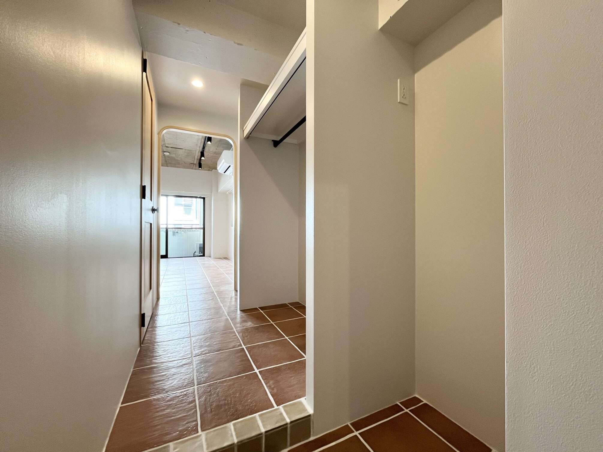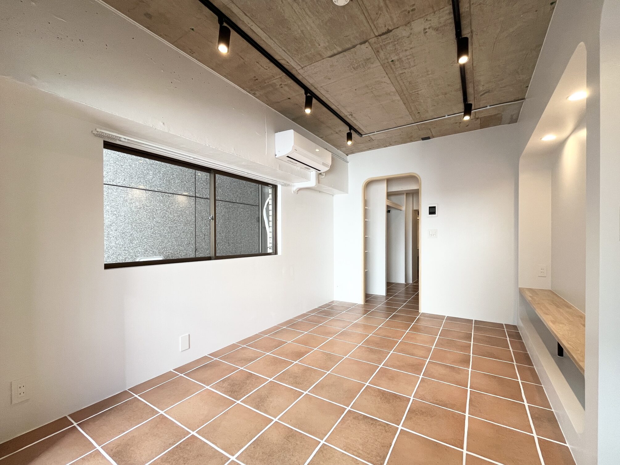 東京メトロ半蔵門線「半蔵門」駅から徒歩わずか2分。麹町や皇居のあるビジネス街。飲食店も豊富な街並みはいわゆる「東京」を体感できる街。そんな半蔵門の街に、リノベーションシリーズ「Boho」の部屋があります。自分だけのためのギャラリースペースのような、洗練されたアーティスティックな空間に仕上がりました。テラコッタ調の磁気タイルが敷き詰められた2面採光の居室には、壁を彫り込んだディスプレイシェルフを2種類のサイズで造りました。それぞれのシェルフに、お気に入りのアイテムやアートを並べて楽しむことができます。収納は廊下部分にワイドのあるオープンクローゼットと可動棚を設置。部屋の中央となる場所に収納を置くことで、水回りと合わせて自分を整えるスペースとして生活動線をまとめています。収納だけでなくキッチンも玄関側に設置することで、より居室を『表現する場所』として位置付けています。毎日自分の好きなものに囲まれて、今日もいい部屋だなと思いながら過ごす、そんな時間が送れそうです。