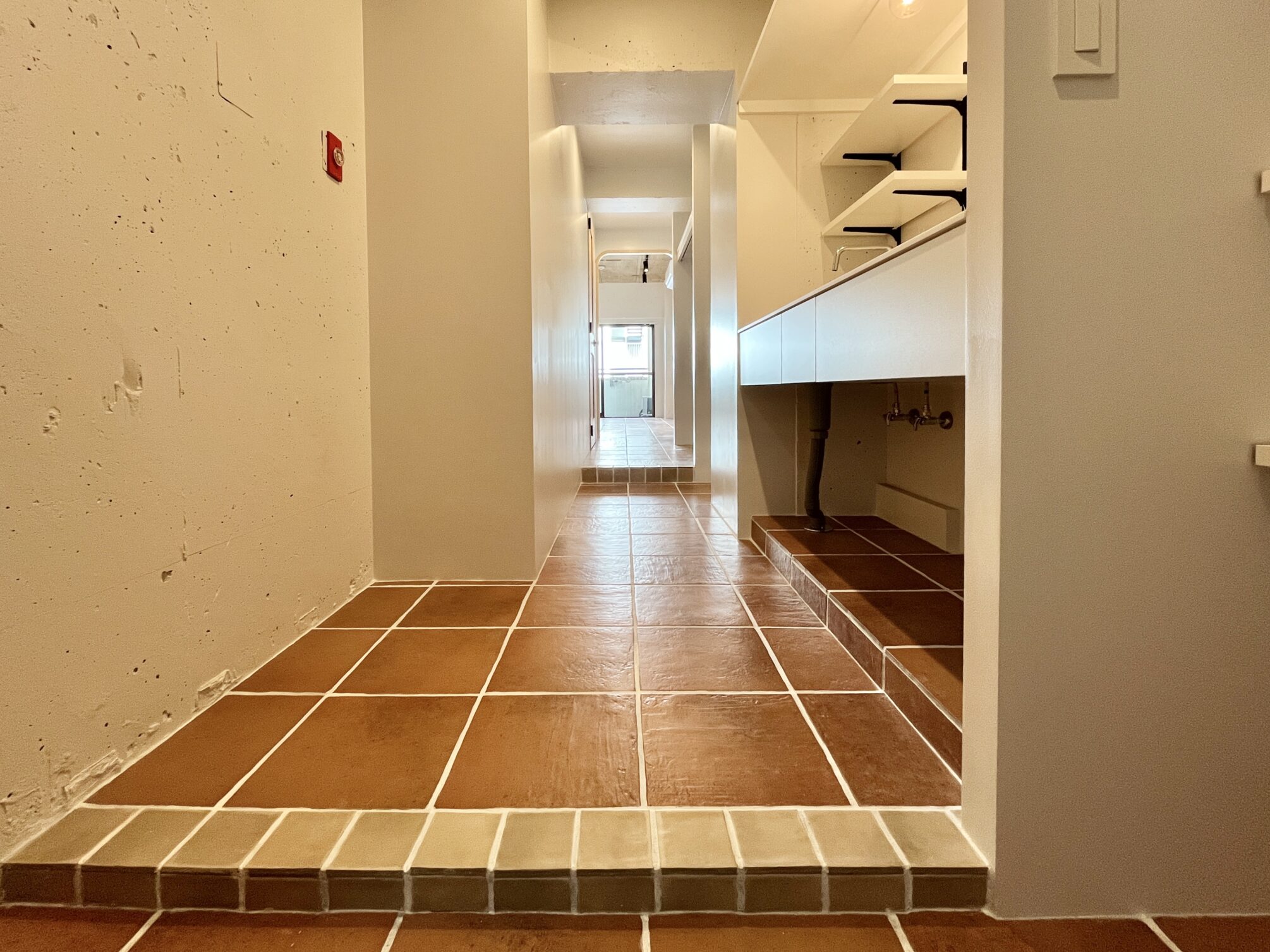 テラコッタ調の磁器タイルを床に敷いていきます。むら感のある赤い色味が、部屋にあたたかでやわらかな空気をもたらしてくれます。ひとつ一つのタイルの質感にも愛着が湧いてきそうです。