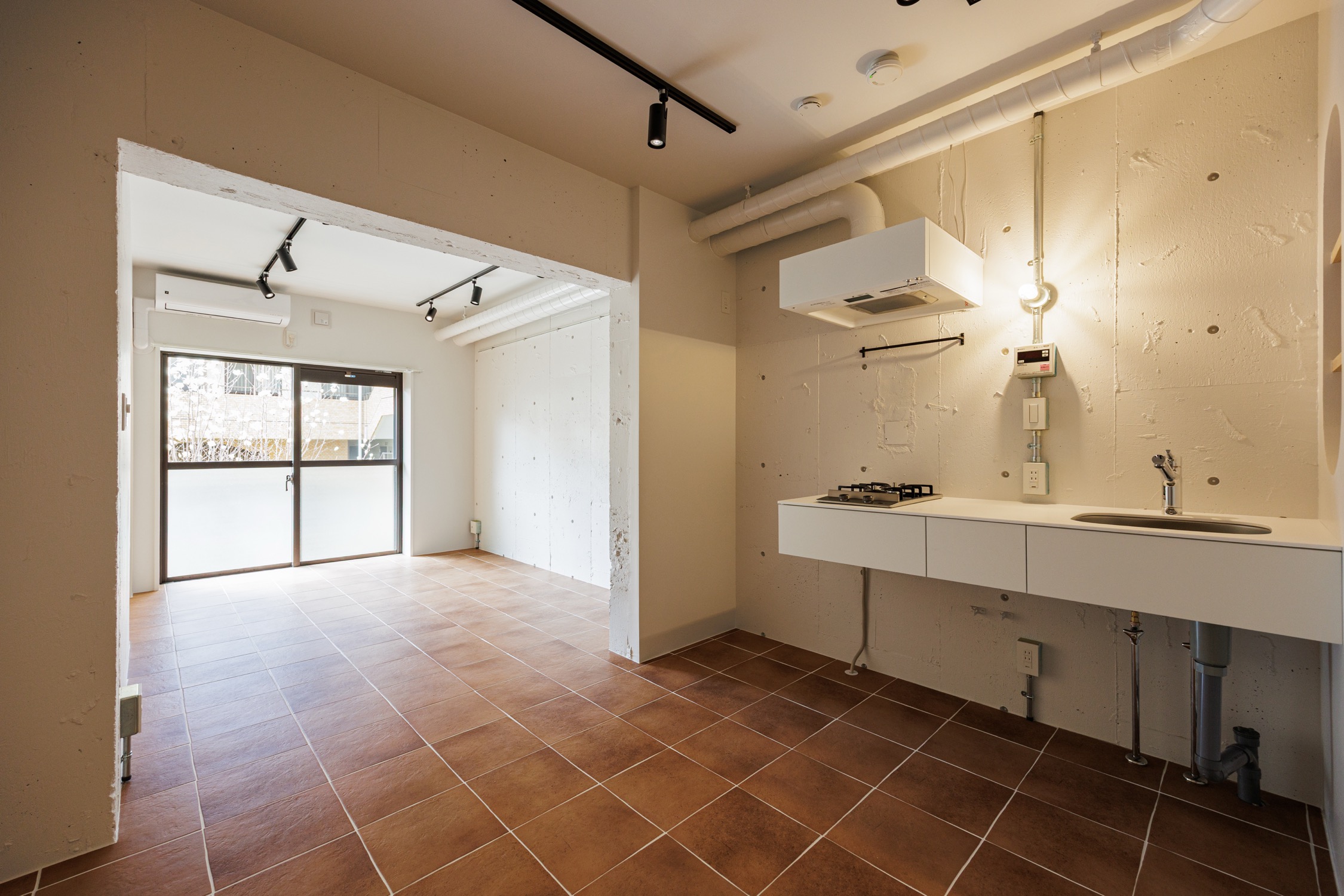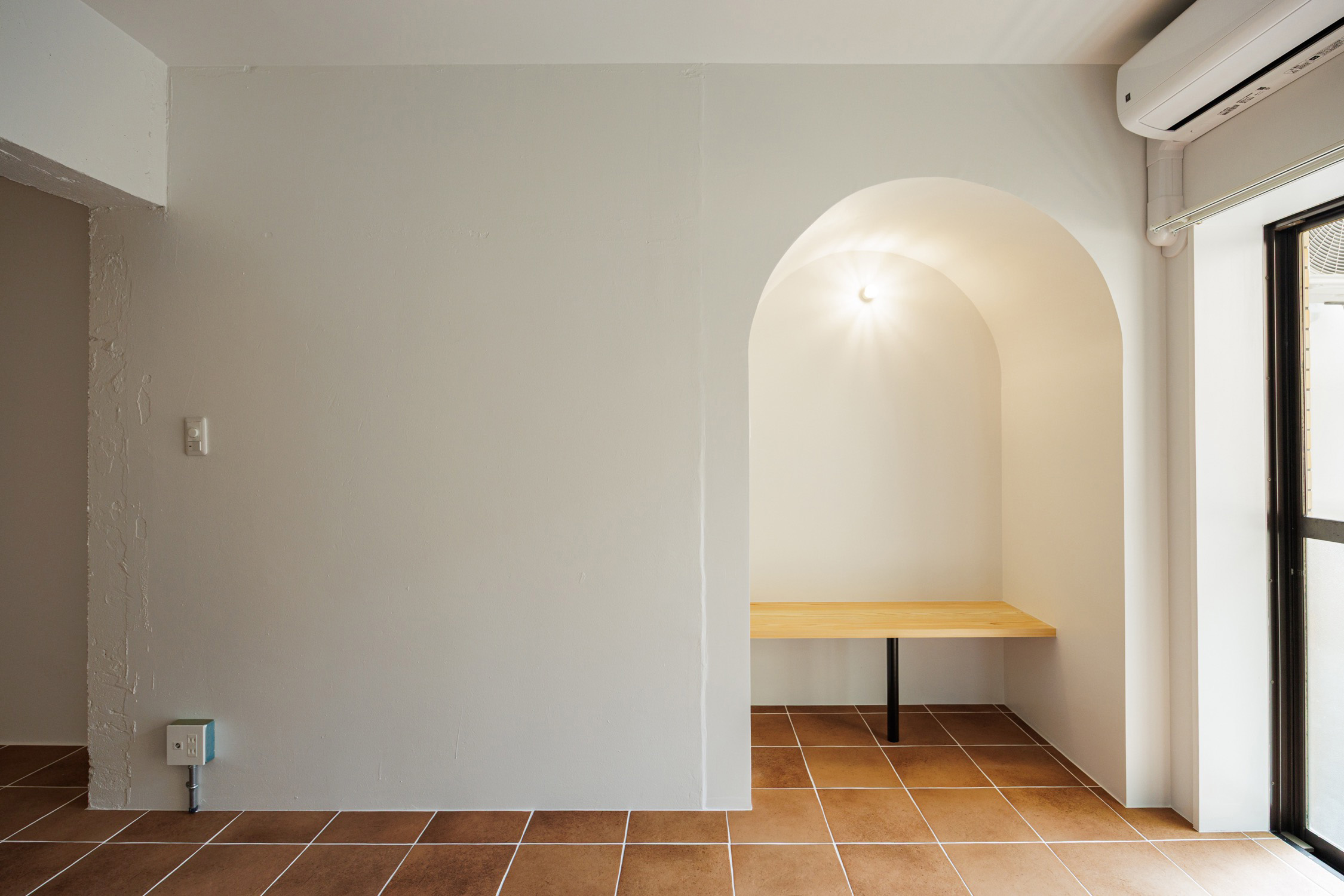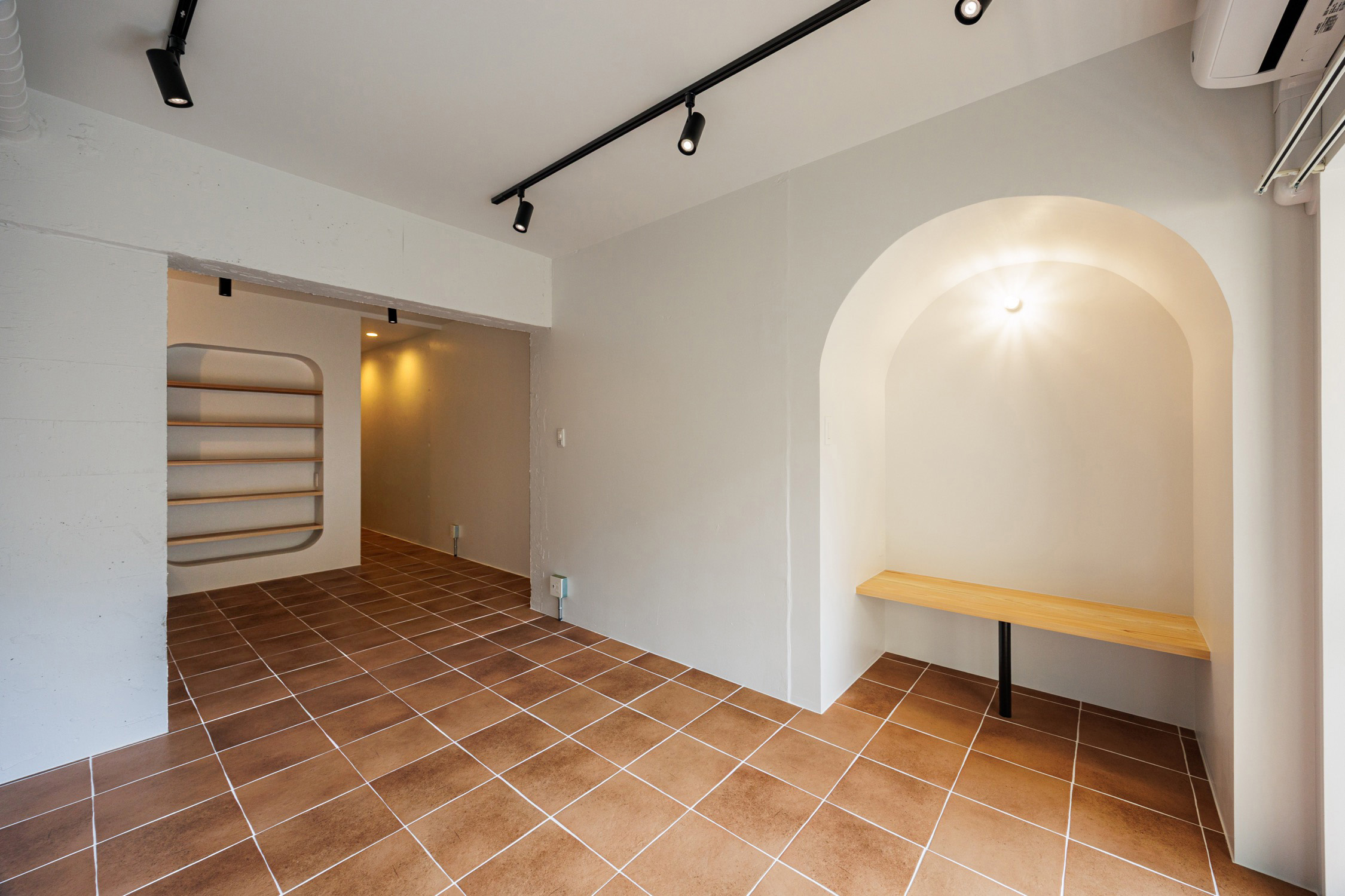 新宿区にありながら落ち着いた住宅街が広がる静かなエリア、牛込柳町。都営大江戸線で都心へ出やすく、神楽坂や市ヶ谷も生活圏。派手さはないが、穏やかな街並みと生活利便性のバランスが魅力の暮らしやすい街。玄関を開けると、居室へと続く渋みのあるオレンジのテラコッタタイル。玄関先の可動棚はたっぷりシューズクロークとして活用して。廊下にはクローゼットと上部の収納棚。カーテン付きで隠すことができます。居室は既存の壁をいかして緩やかにゾーニング。キッチン横のディスプレイシェルフは丸くくり抜かれたデザインが魅力的。見栄えの良い調味料などを置きたくなりますね。居室奥にはシェルフにもベンチにもなるカウンターを造作。ブラケットライトに照らされた空間でゆったりとくつろぐことができます。タイル床はお手入れも楽々ながらデザイン性も高く、インテリアの組み合わせも楽しめそうな予感です。