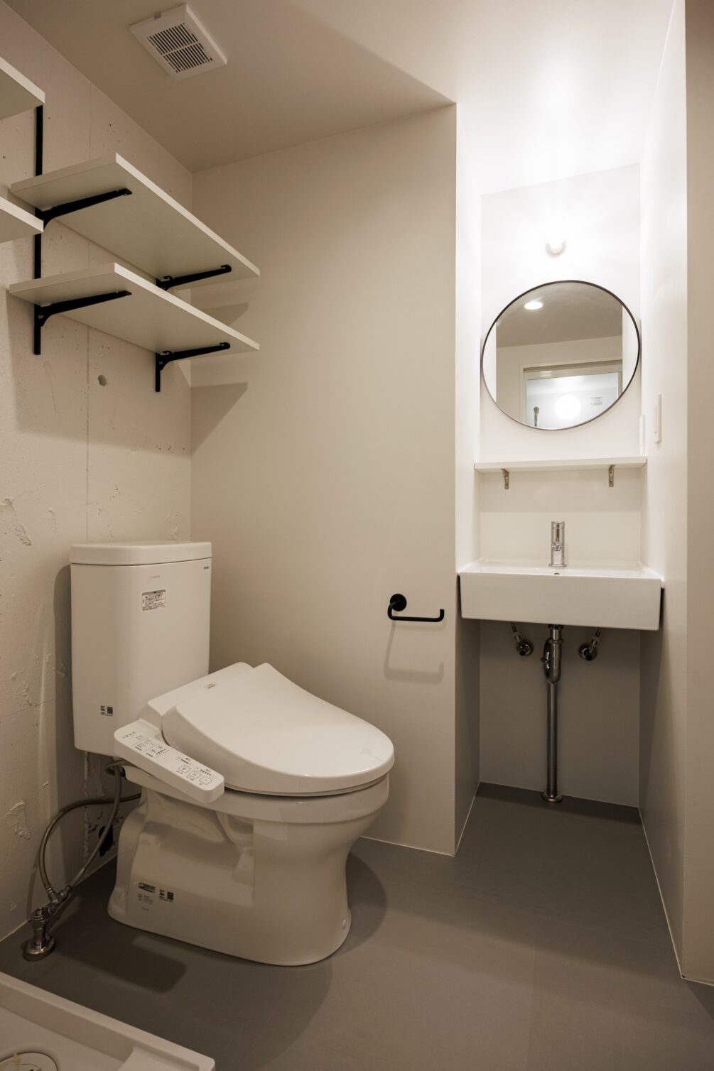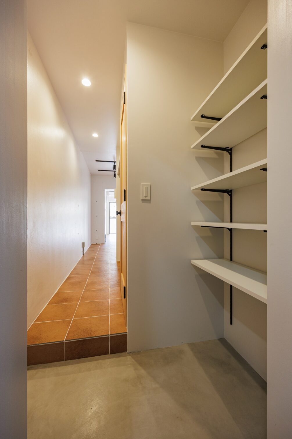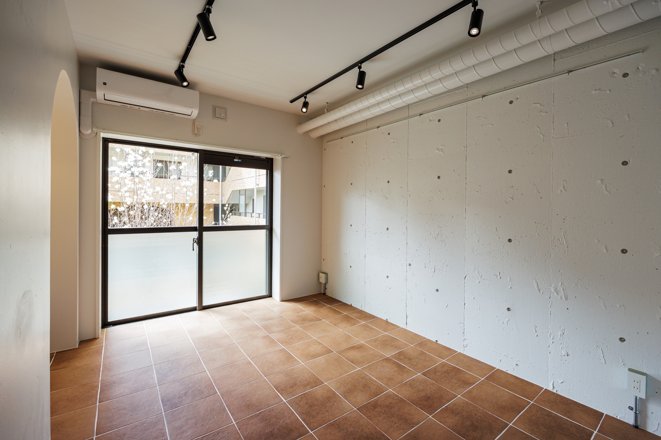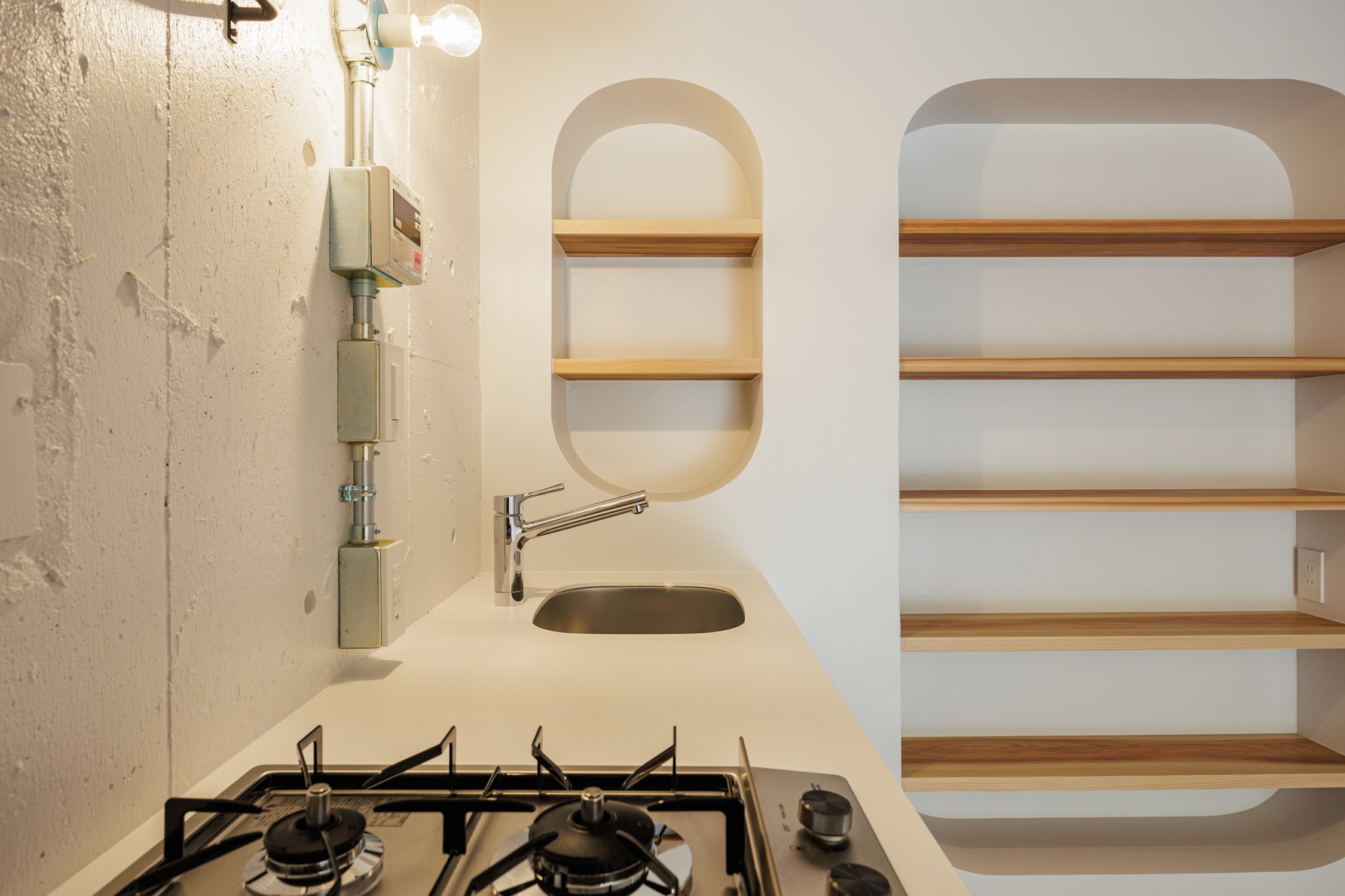 新宿区にありながら落ち着いた住宅街が広がる静かなエリア、牛込柳町。都営大江戸線で都心へ出やすく、神楽坂や市ヶ谷も生活圏。派手さはないが、穏やかな街並みと生活利便性のバランスが魅力の暮らしやすい街。玄関を開けると、居室へと続く渋みのあるオレンジのテラコッタタイル。玄関先の可動棚はたっぷりシューズクロークとして活用して。廊下にはクローゼットと上部の収納棚。カーテン付きで隠すことができます。居室は既存の壁をいかして緩やかにゾーニング。キッチン横のディスプレイシェルフは丸くくり抜かれたデザインが魅力的。見栄えの良い調味料などを置きたくなりますね。居室奥にはシェルフにもベンチにもなるカウンターを造作。ブラケットライトに照らされた空間でゆったりとくつろぐことができます。タイル床はお手入れも楽々ながらデザイン性も高く、インテリアの組み合わせも楽しめそうな予感です。