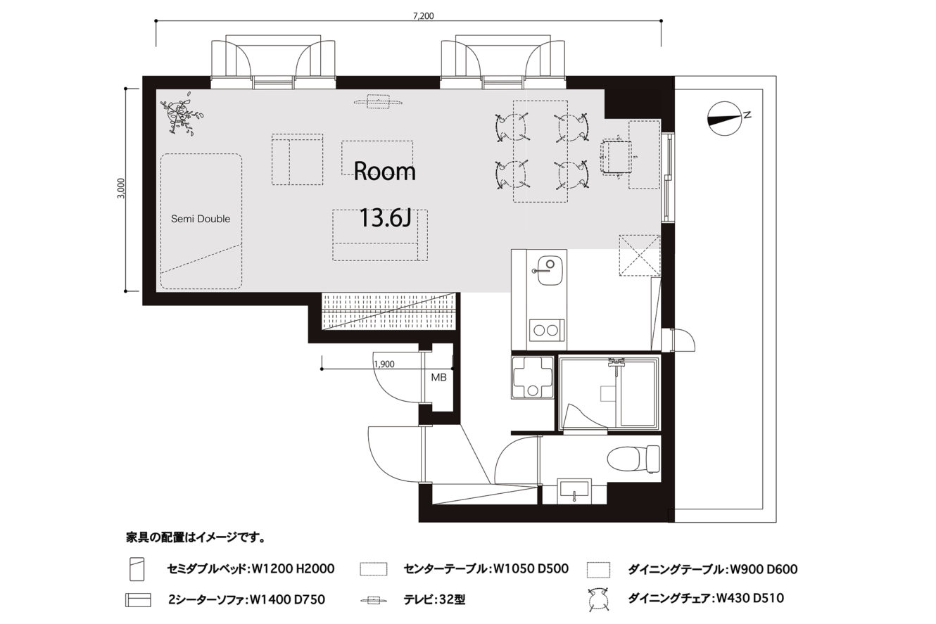 部屋の前に着き、少し重たい扉をグッと開ける。まず見えたのはかなり幅広の下足棚で、靴を置くだけでない使い方に思案が広がる。水回りはコンパクトだが、使い勝手は十分過ぎるほどだ。居室に入る部分のカウンターキッチンは、つい向こう側の誰かと話したくなるいい距離とサイズ感。部屋を印象付けるのは、建物の骨格を主張してくる梁と天井、そこに這う剥き出しの配管、壁に貼られたブリックタイル。行ったことはないけど、テレビで見た東海岸のスタジオを想起した。