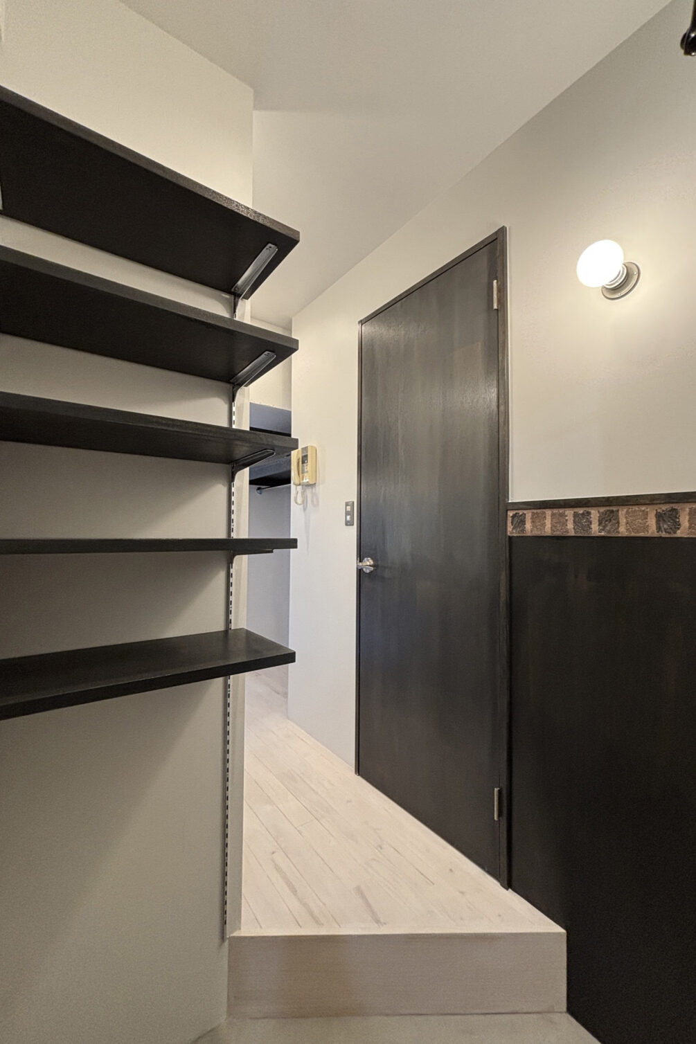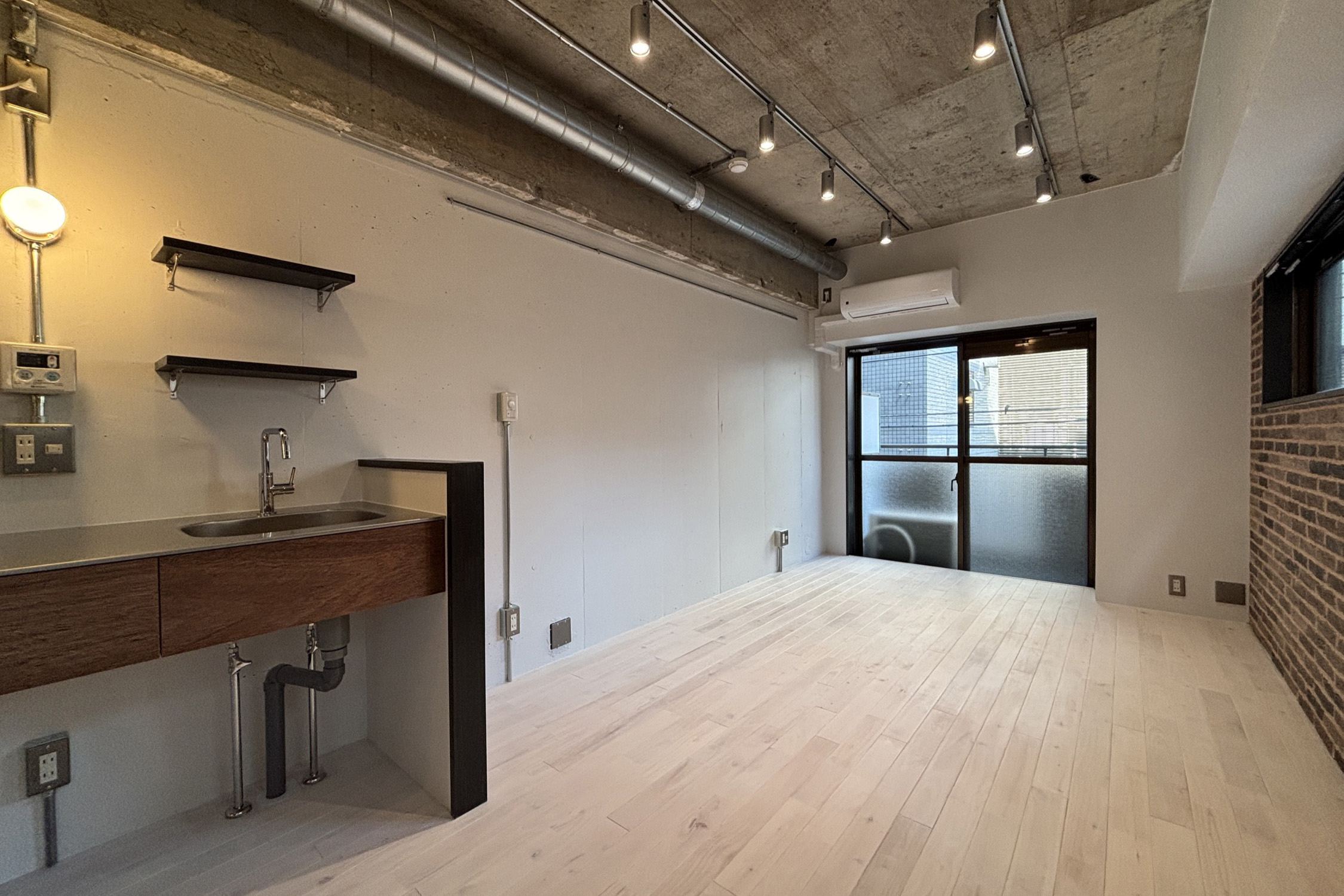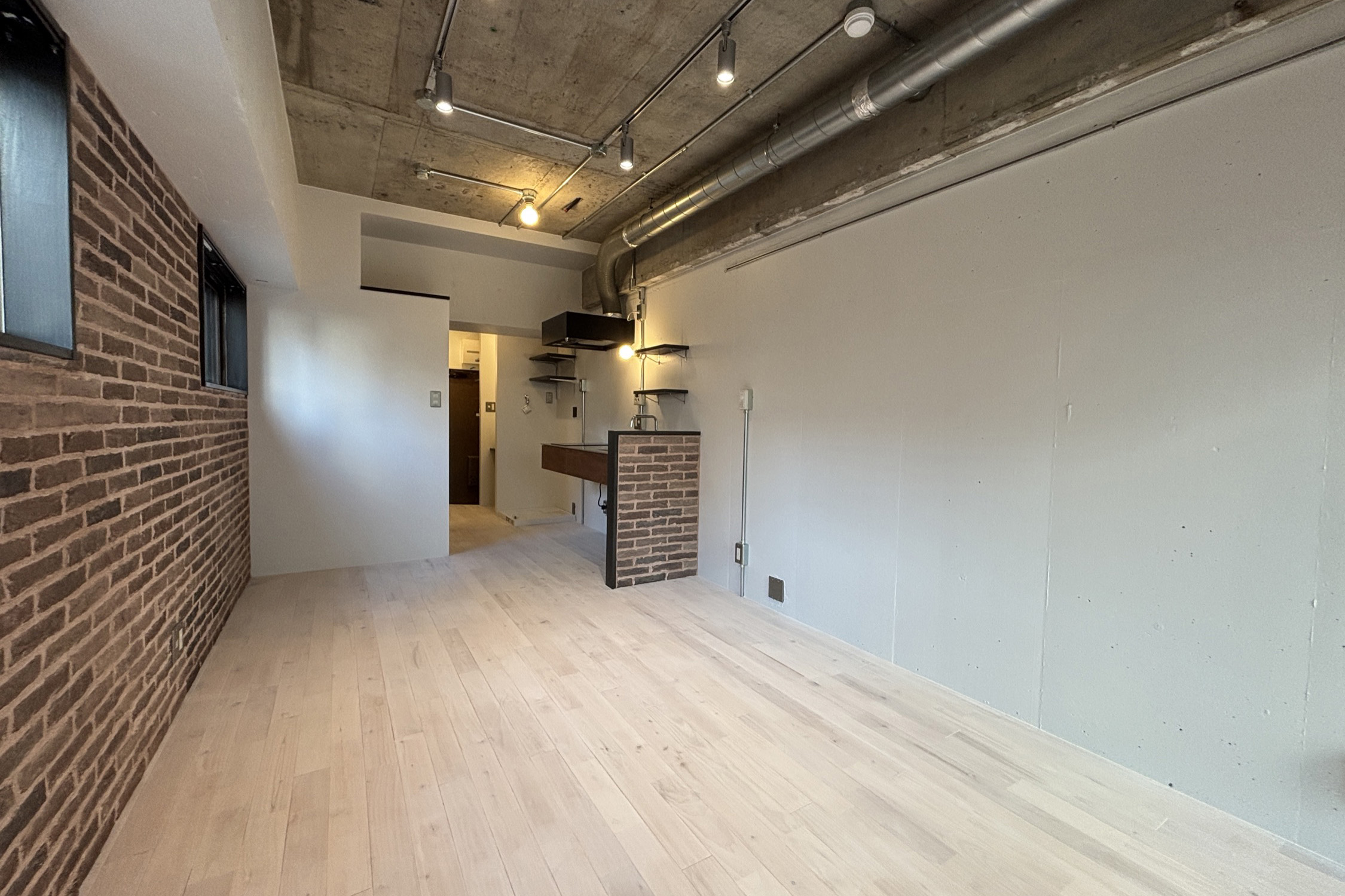 大江戸線・浅草線の2路線が利用できる「大門」駅。再開発が進み、日々アップデートされる街でありながら、「旧芝離宮恩賜庭園」の緑が日常に柔らかさを与えてくれるこの街に、「Brick」シリーズ100個目のお部屋が完成しました。南側のタイル壁と絡めた窓から差し込む光は、お部屋をやさしく照らしてくれます。窓辺とキッチン横の間切には深みのあるタイルを使用。ダークな色味のシナ材との組み合わせでお部屋全体はシックな印象に。落ち着いたカラーの中に、グリーンやお気に入りのアートを飾れば色味とのコントラストも楽しめます。タイル壁の反対の大きな壁にはピクチャーレールをあしらい、空間作りのポイントに。まるでスタジオのようなお部屋に、自分だけの空間を作ってみませんか。