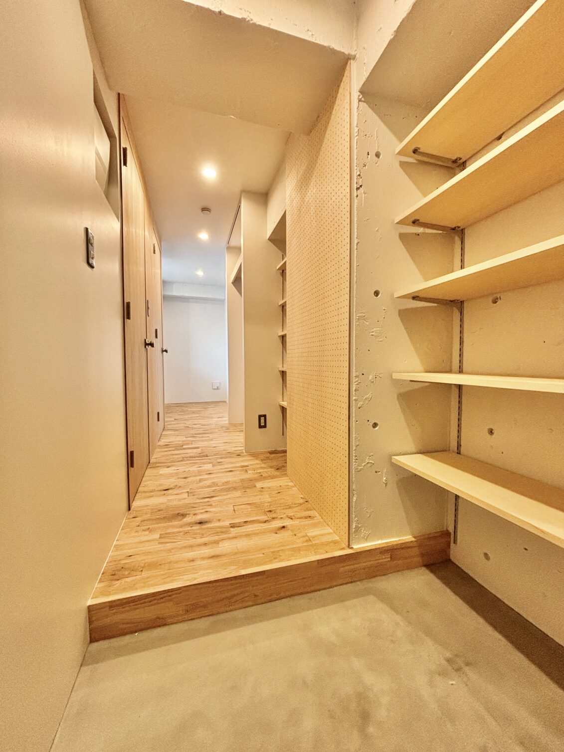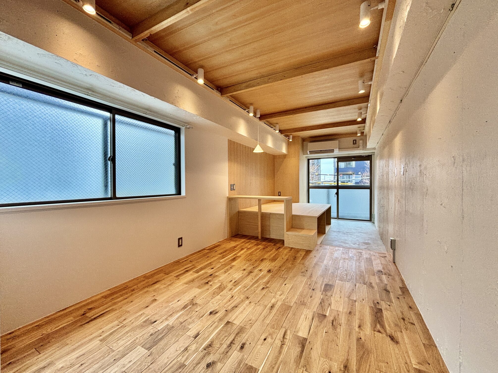 西荻窪は、個性ある個人店や古書店、カフェが点在する穏やかな街。商店街が生活に寄り添い、日常の買い物もしやすい。派手さはないが、感性を大切にしながら、肩の力を抜いて暮らしたい人に心地よいエリアです。そんな魅力的な街に登場した「CABIN」シリーズ。無垢材の心地よさとモルタル土間の使い勝手に加え、個性的な間取りにCABINの特徴であるおこもりスペースを工夫して入れ込みました。扉を開けてすぐ、水回りを1列にまとめました。キッチンの斜めの壁には三角形のカウンターを設置し、食器や調理器具などを置けるスペースに。右に曲がると奥行のある居室が広がります。ベッドスペース想定の小上がり下はオープン収納に。床面はモルタルに切り替えられているので、観葉植物などを並べてみるのもおすすめ。小上がりに上がる階段と繋げ、ちょっとしたデスクを造作するなどギミックの効いたお部屋です。ゆったり一人暮らしもよし、二人暮らしもできそうな予感です。