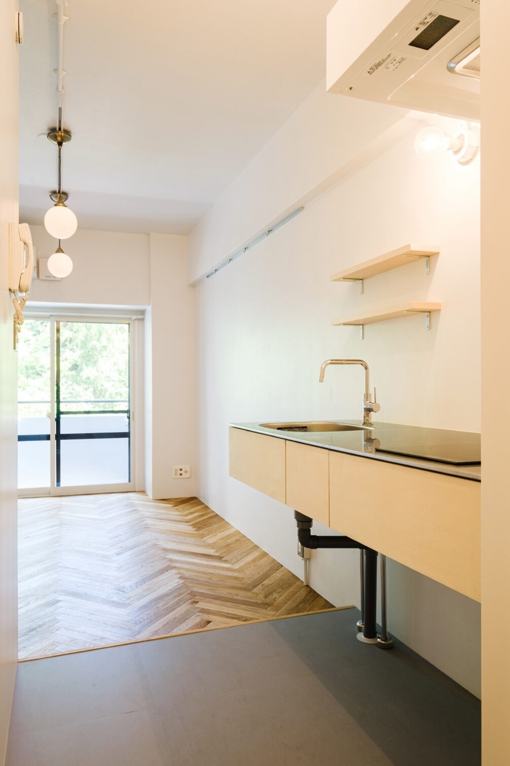 池袋や有楽町など、主要都市へのアクセスがしやすい「江戸川橋」駅から徒歩5分。四季の変化が楽しめる神田川沿いの江戸川橋公園や、老舗の飲食店、ギャラリー併設のカフェなど日々の生活の中で、新旧の文化を体感できるエリアです。そんな由緒正しい街にあるのがリノベーション賃貸「Chic」。一枚ずつ丁寧に貼られたヘリンボーンの無垢床と、潔く白で塗装された壁や天井が、窓から見える緑を優しく映します。クラシックな印象のボールライトは、調光機能付きなので、季節や時間に合わせて灯りを変えて気分を演出して。コンパクトながら、カウンター付きの洗面化粧台や、扉付きのクローゼットなど機能面はしっかりと。洗練された空間で窓の外を眺めながら、穏やかに、贅沢な時間を過ごしてみてはいかがでしょう。