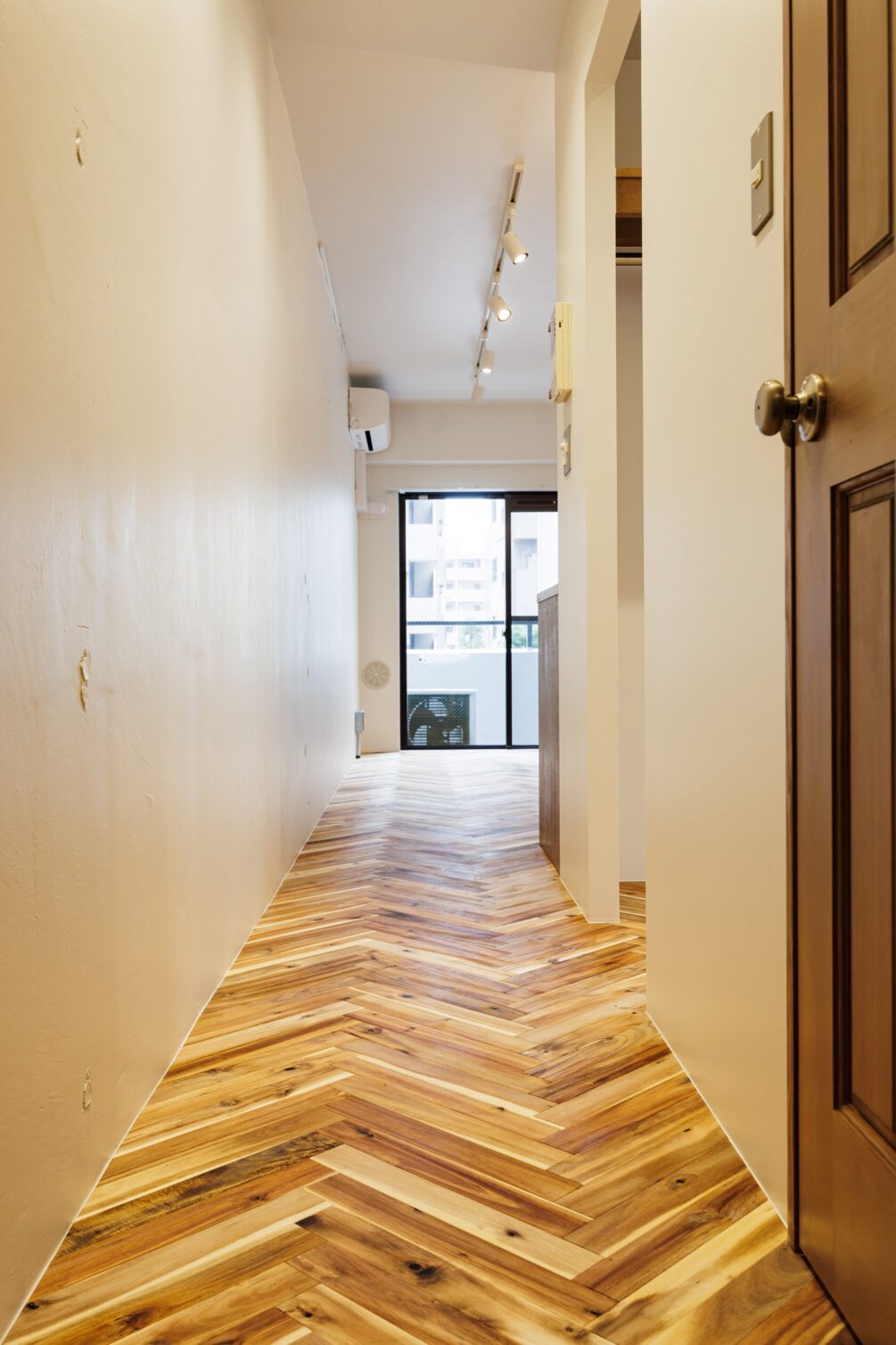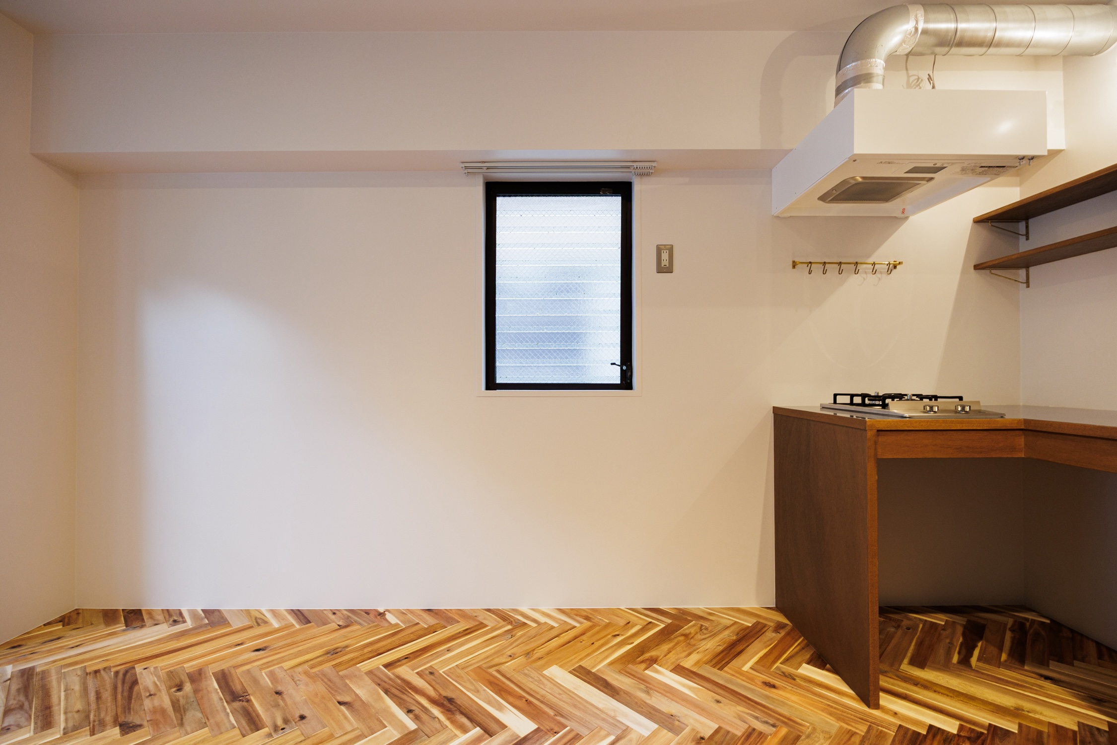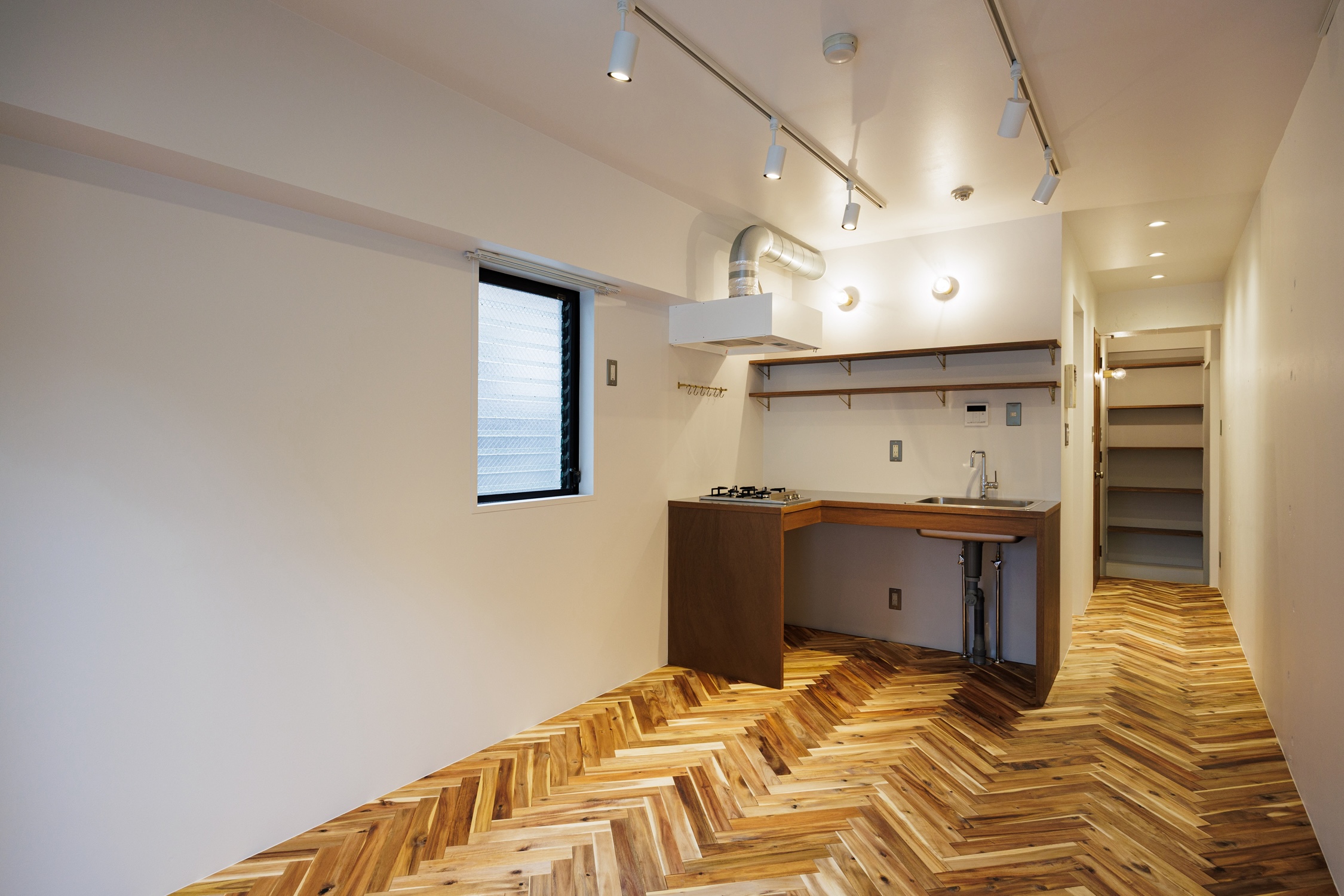 都営新宿線「大島」駅。急行停車駅で、新宿まで1本で行けるアクセスが魅力。下町情緒を感じられる街には、100年商店街として有名な大島中の橋商店街があり、活気あるお店を巡ってする買い物が便利で楽しい。そんな大島の街に、リノベーションシリーズ”Chic”の部屋があります。アカシア材を使ったヘリンボーンの床が美しい洗練された空間に仕上がりました。玄関を上がった先から、矢印を描くように居室に伸びた組み木の床材により吸い込まれていく。廊下の右手にはコンパクトにまとまった水回り、その先にはウォークインクローゼットがある。クローゼットは小窓から光差し込む場所に洗濯機置き場を取り込み、ちょっとしたランドリースペースに。居室には小窓の脇にL字型のキッチンを設置し、作業スペースを広めに取りました。ワイドのある2段の棚には、お気に入りのお皿や道具を並べてディスプレイにするのもよし。家族や友人を招くのが楽しみになりそうです。ディテールまでこだわり抜いた空間は、本物の素材が息づき、東京で暮らす日常から戻った時に、どこかホッとするような場所です。