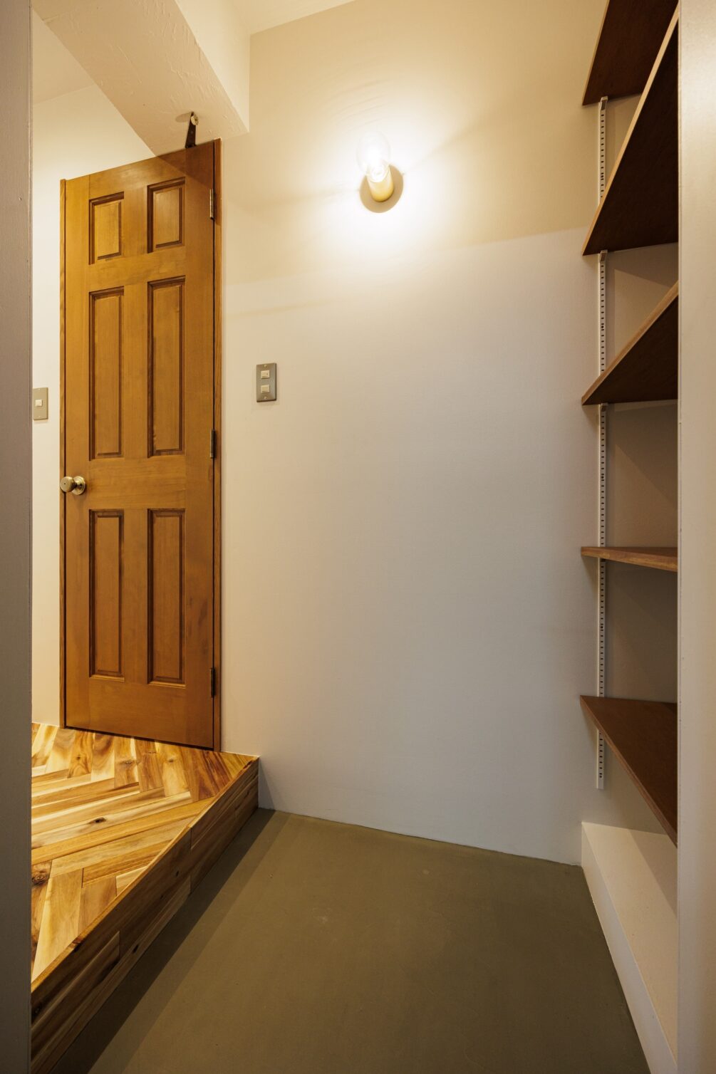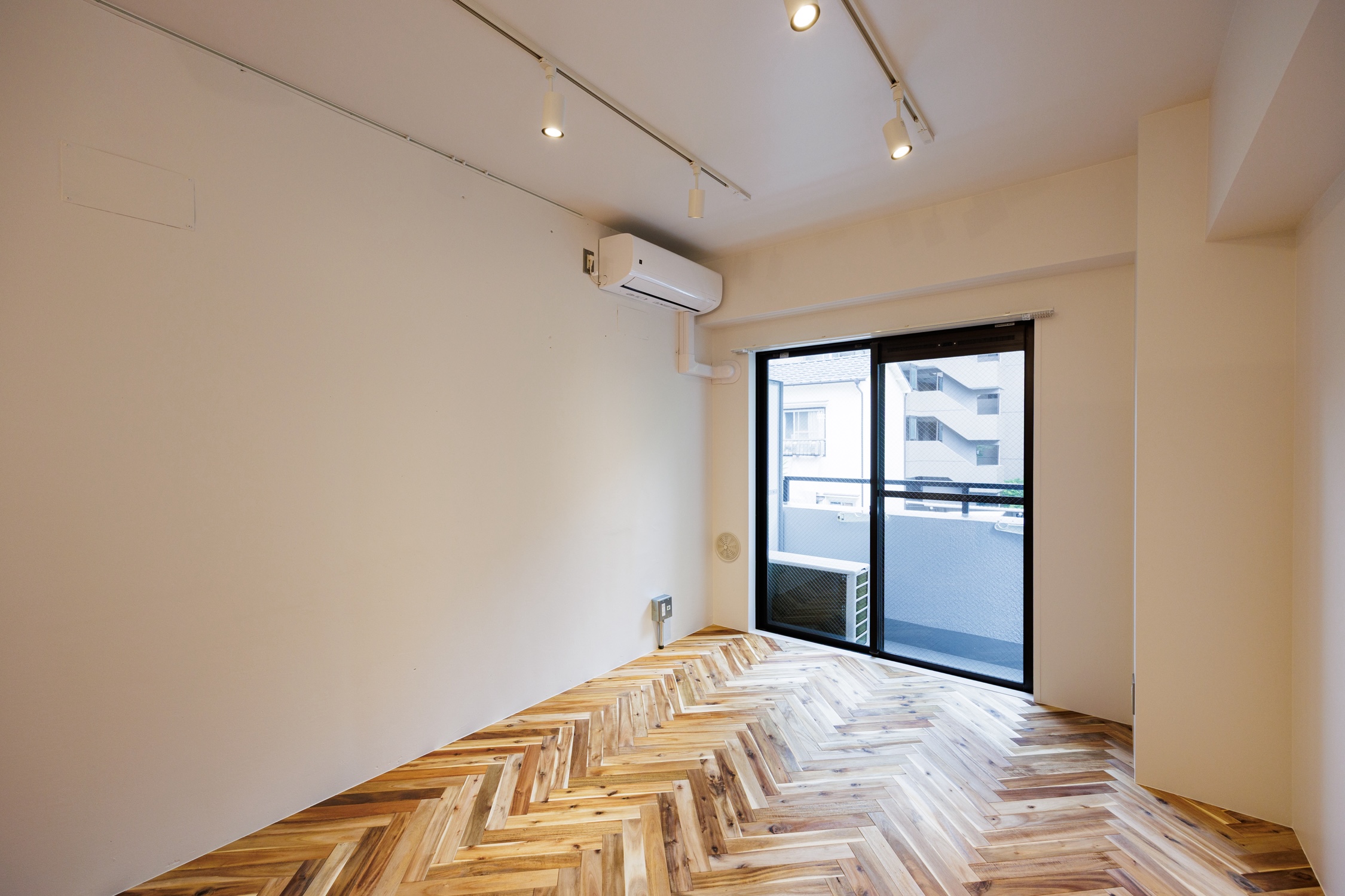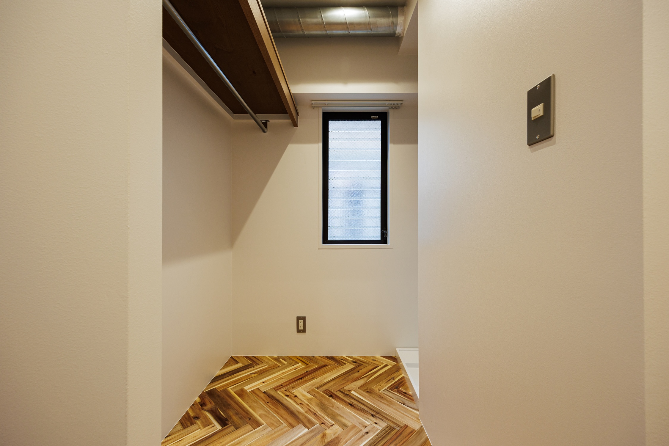 都営新宿線「大島」駅。急行停車駅で、新宿まで1本で行けるアクセスが魅力。下町情緒を感じられる街には、100年商店街として有名な大島中の橋商店街があり、活気あるお店を巡ってする買い物が便利で楽しい。そんな大島の街に、リノベーションシリーズ”Chic”の部屋があります。アカシア材を使ったヘリンボーンの床が美しい洗練された空間に仕上がりました。玄関を上がった先から、矢印を描くように居室に伸びた組み木の床材により吸い込まれていく。廊下の右手にはコンパクトにまとまった水回り、その先にはウォークインクローゼットがある。クローゼットは小窓から光差し込む場所に洗濯機置き場を取り込み、ちょっとしたランドリースペースに。居室には小窓の脇にL字型のキッチンを設置し、作業スペースを広めに取りました。ワイドのある2段の棚には、お気に入りのお皿や道具を並べてディスプレイにするのもよし。家族や友人を招くのが楽しみになりそうです。ディテールまでこだわり抜いた空間は、本物の素材が息づき、東京で暮らす日常から戻った時に、どこかホッとするような場所です。