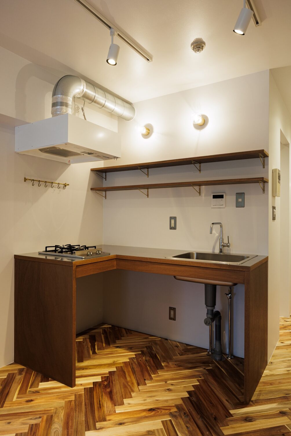 キッチンはL字型に配置することで作業スペースも大きく取りました。壁一面の2段の棚にお気に入りのお皿や道具を並べてディスプレイのように収納するのも良さそうです。家族や友人を招くのが楽しみになるような、そんな暮らしがこの部屋で実現できそうです。