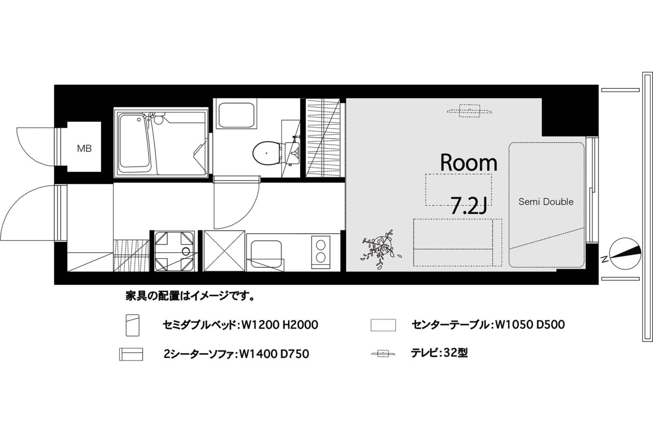 居室全体をアイボリーの色味の塗装で明るく優しい雰囲気に。居室のファサードを飾るウッドウォールは、温かみのあるラフな印象です。ペンダントライトとブラケット照明がヨーロピアンな雰囲気を演出。シンプルな間取りですが、しっかり広さが確保され、住み心地の良い空間です。ワンルームですが、アンティークな世界観が広がる完成度の高いお部屋です。