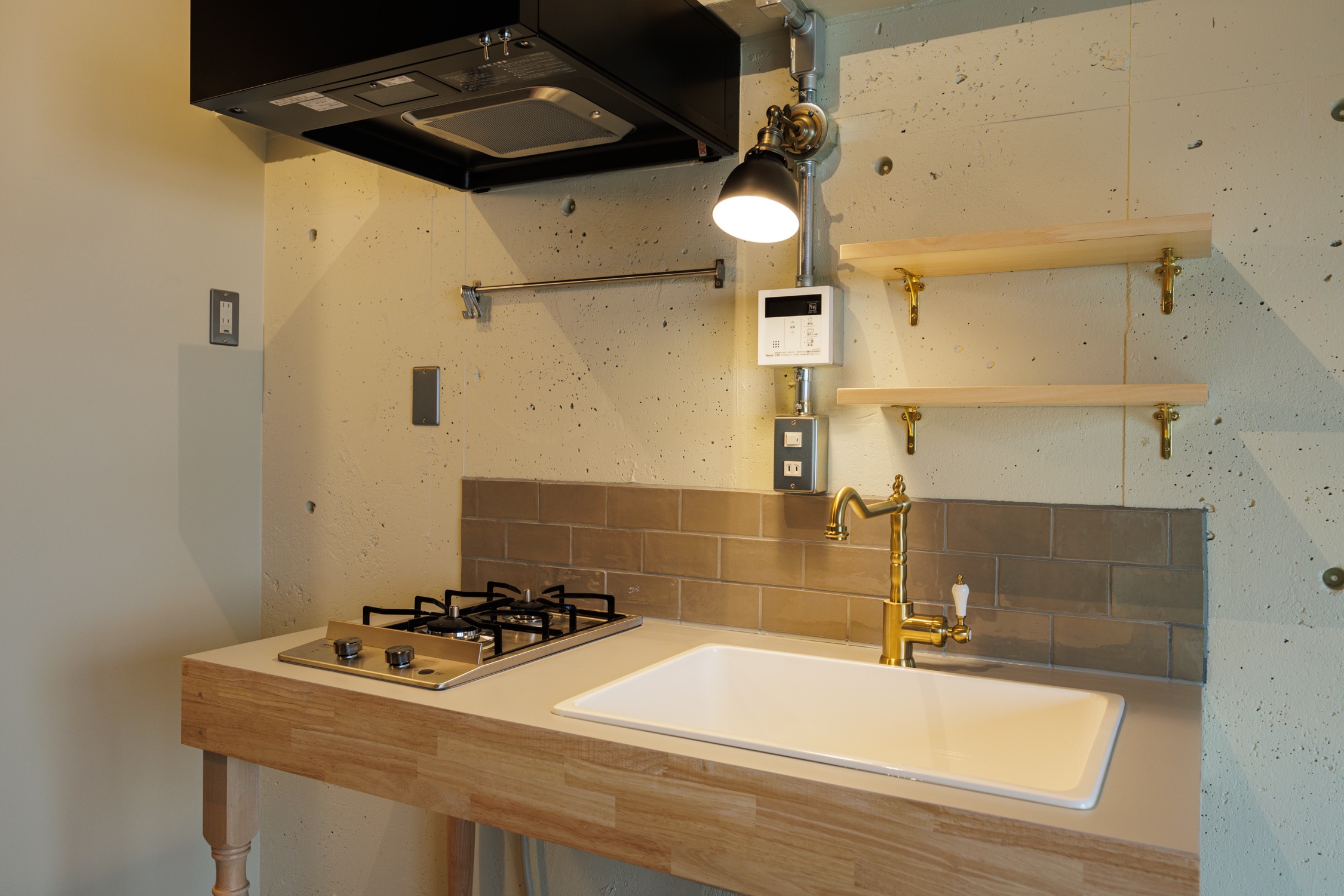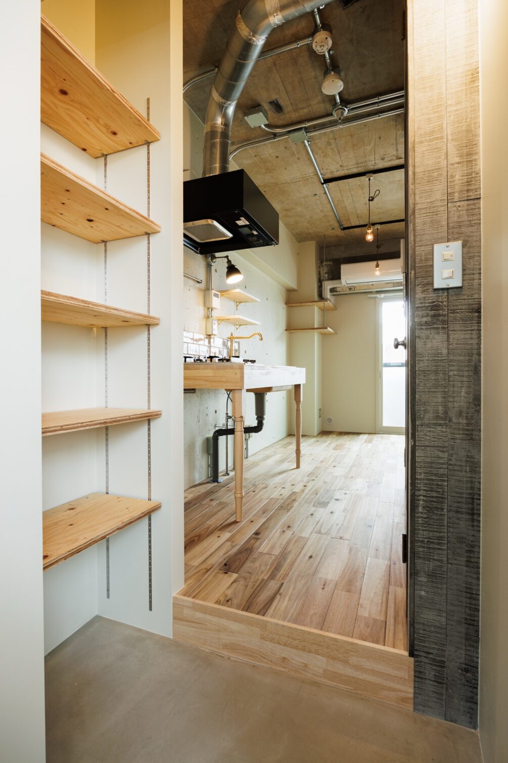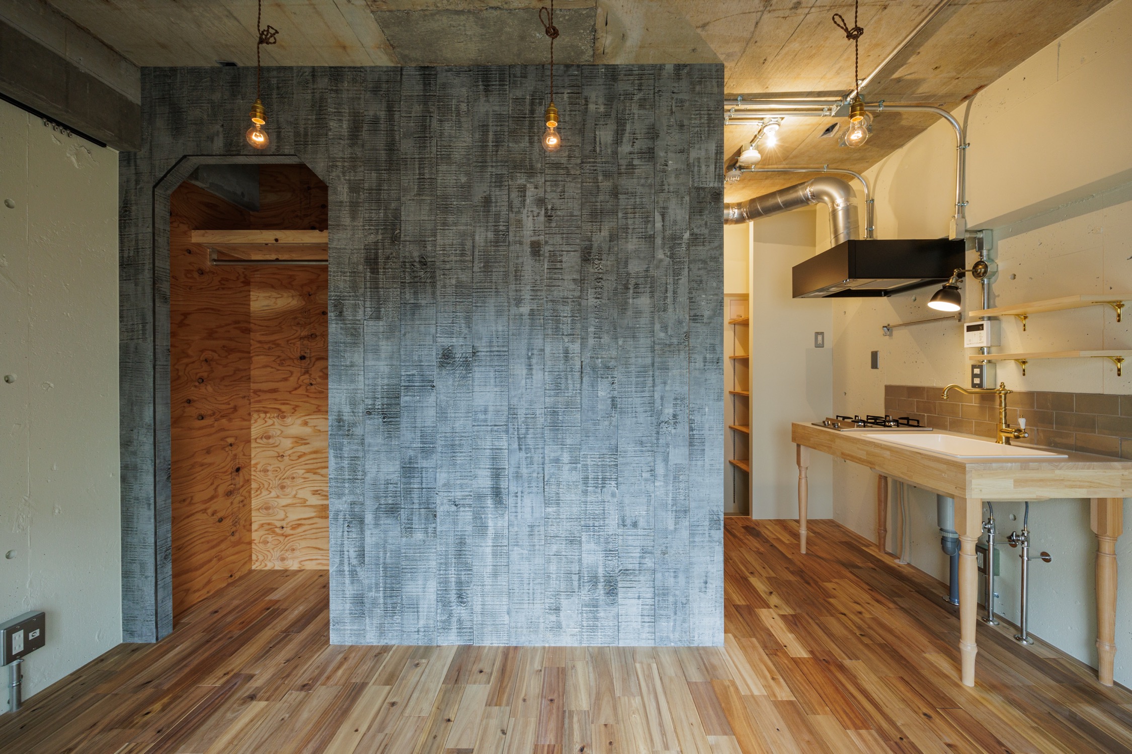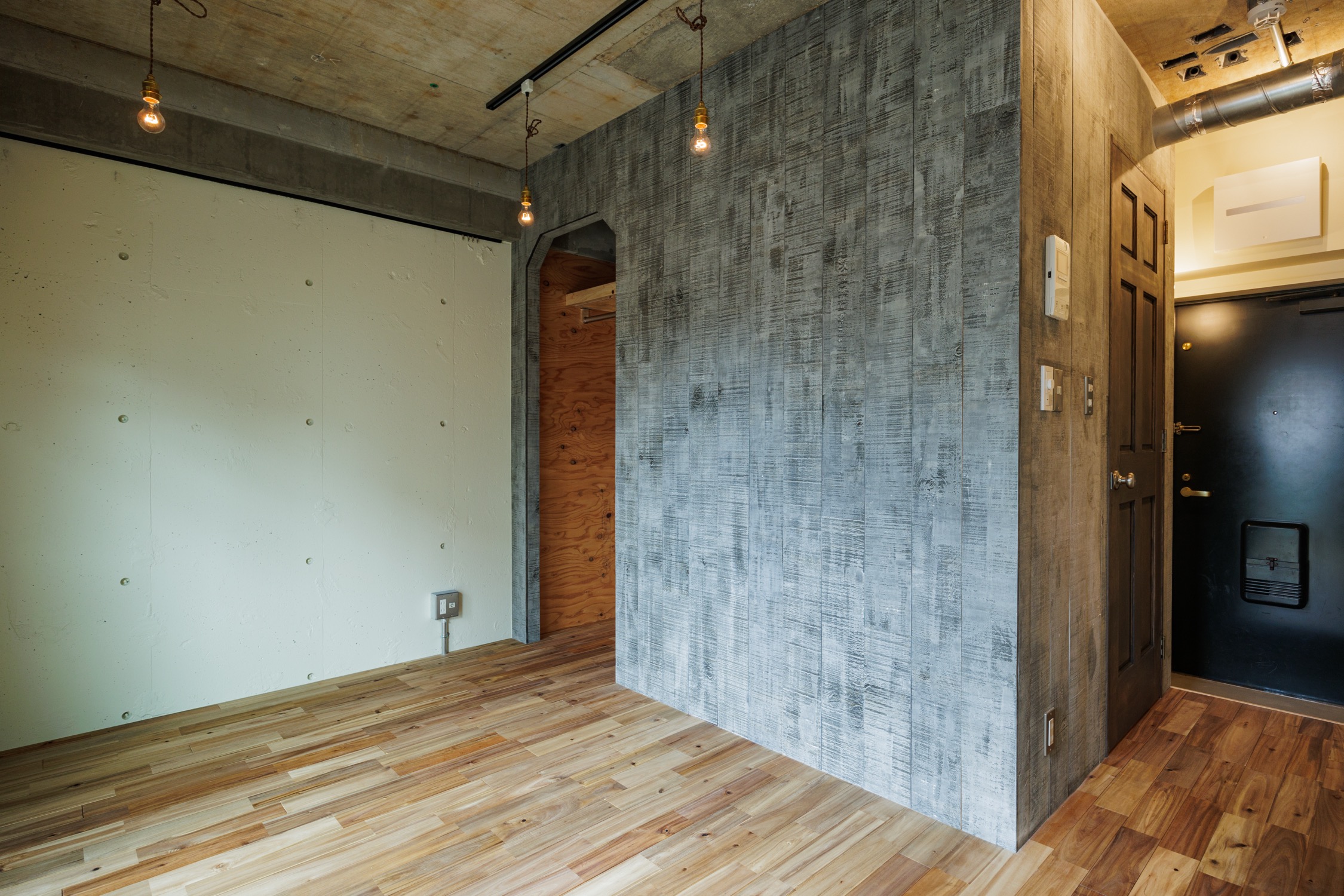 落ち着きのある住宅街とおしゃれなショップが共存する代官山。最新カルチャーやデザインに触れながら、自分らしい暮らしを楽しみたい人におすすめの街に「Cotton」シリーズがあります。躯体とベージュ塗装の壁、アンティーク調のウッドウォールが柔らかかつ絶妙な粗野感を醸し出しているお部屋。キッチンは居室入ってすぐの手前にまとめて。ろくろ脚がヨーロピアンな雰囲気です。フローリングは赤みのある無垢材をセレクト。ごろんと寝っ転がりたくなるような温かみ感じる素材です。居室の柱型を活かしてディスプレイ兼収納にもなるL字棚を設置。好きなモノを飾りながら収納してみてください。クローゼットは居室奥にまとめて。入り口を少し狭めているからこそごちゃっと感が気になりにくいのも嬉しいポイント。ベージュ色が心地よい空間で心安らぐ暮らしを始めませんか。