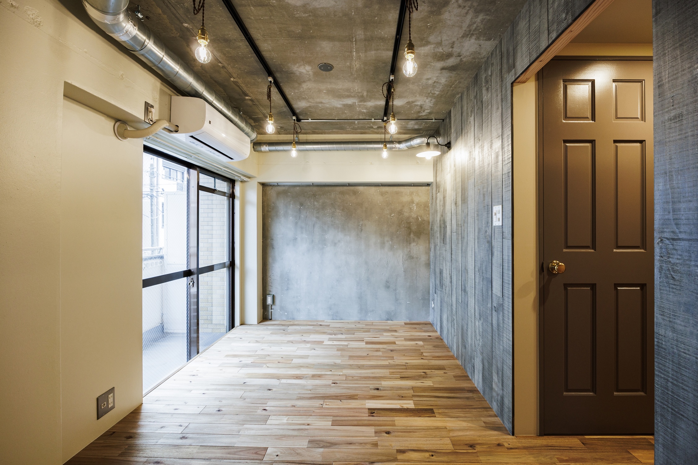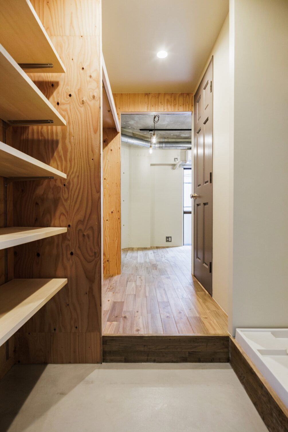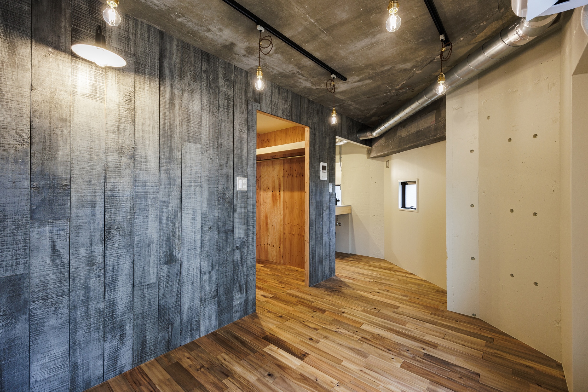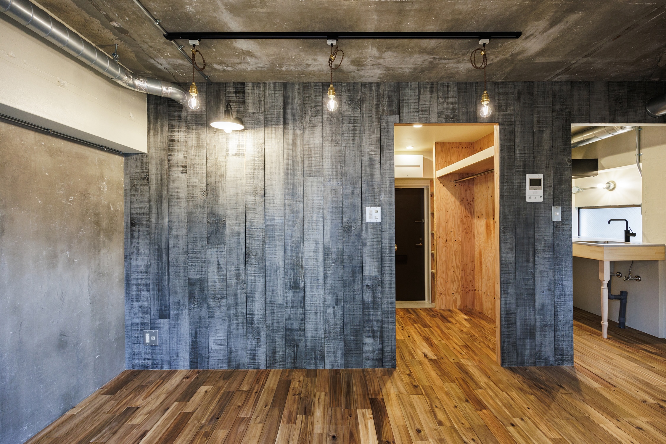 東急目黒線で「目黒」駅から2つ隣のまち「武蔵小山」。東京一のアーケード商店街は日用品が一通り揃う便利さ。休日は「林試の森公園」でのんびり散歩も気持ちがいい。住みやすさ都内トップクラスのそんな街に、リノベーションシリーズ”Cotton”があります。玄関を開けた時と、居室に入った時で印象を分つような空間です。玄関スペースはラーチ材で組まれた収納周りとアカシアの床材が、木の赤を感じさせるあたたかみのある小屋のような空間。奥に進み居室から振り返ると、ヴィンテージウッド調の壁と剥き出しのコンクリートが醸し出す少し青みを持った空間に。小さな窓のあるキッチンは部屋の奥に配置し、また収納スペースを玄関に置くことで、居室は自由度のある場所にしています。壁面につけたブラケットの下で過ごす時間、部屋の小窓から差し込む陽光、ひとつ一つの時間に愛着を持てるようなお部屋です。