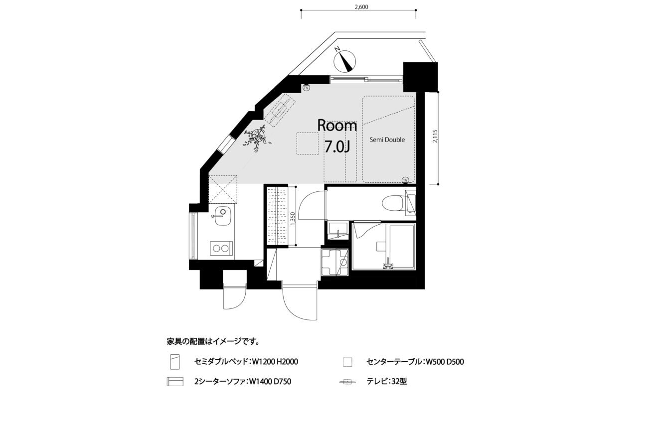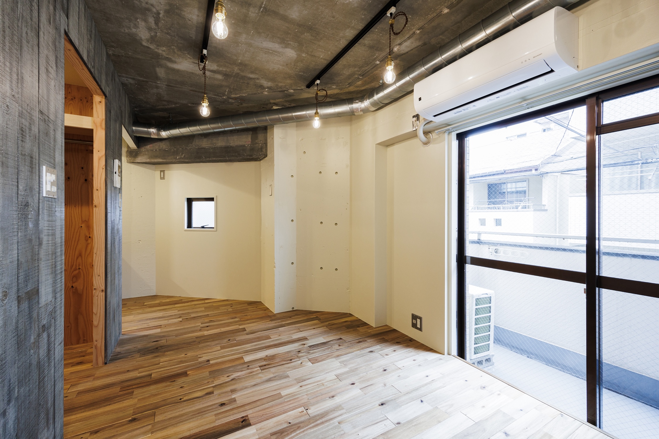 居室に斜めの壁が入った変形間取り。手前に水回りやキッチンをまとめて、居室を広く取りつつ、3箇所ある窓がキッチンや居室を照らすようにプランニングしました。そこにアイボリー色のウッドや剥き出しのコンクリートでCottonらしさを引き出していきます。