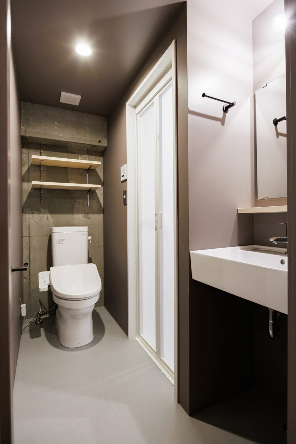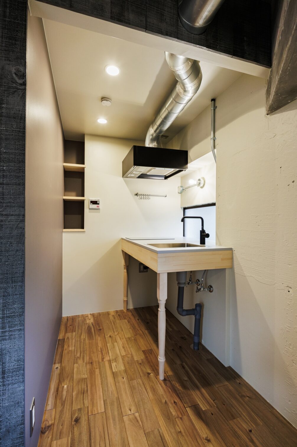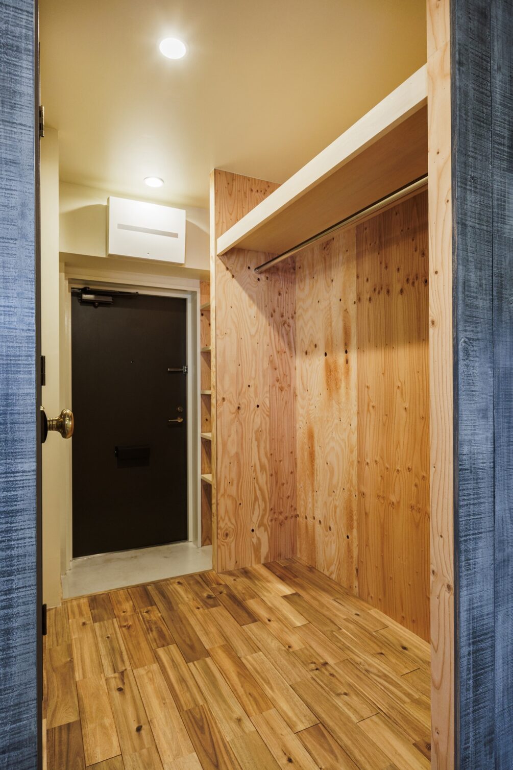 水回りやクローゼットの側面を古材の風合いに仕上げていきます。木材の温もりとコンクリートが持つ荒々しさがちょうどよく混ざり合うようにバランスを取っています。アンティーク調の家具とも合わせやすい空間になりそうです。