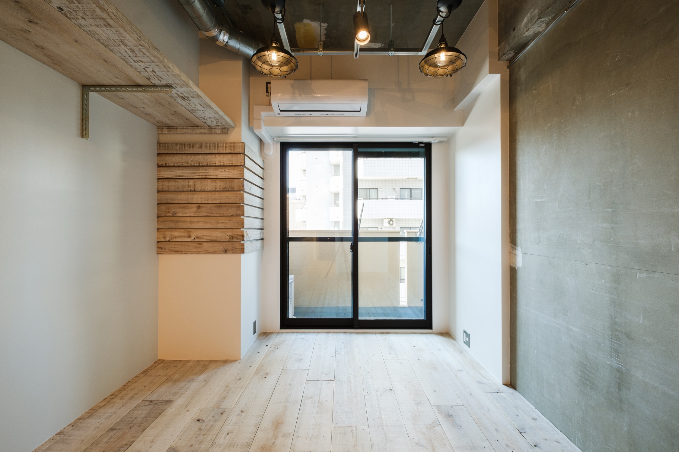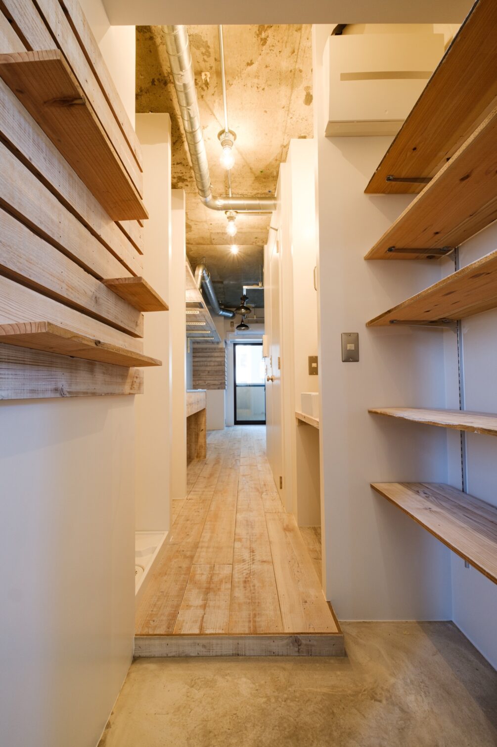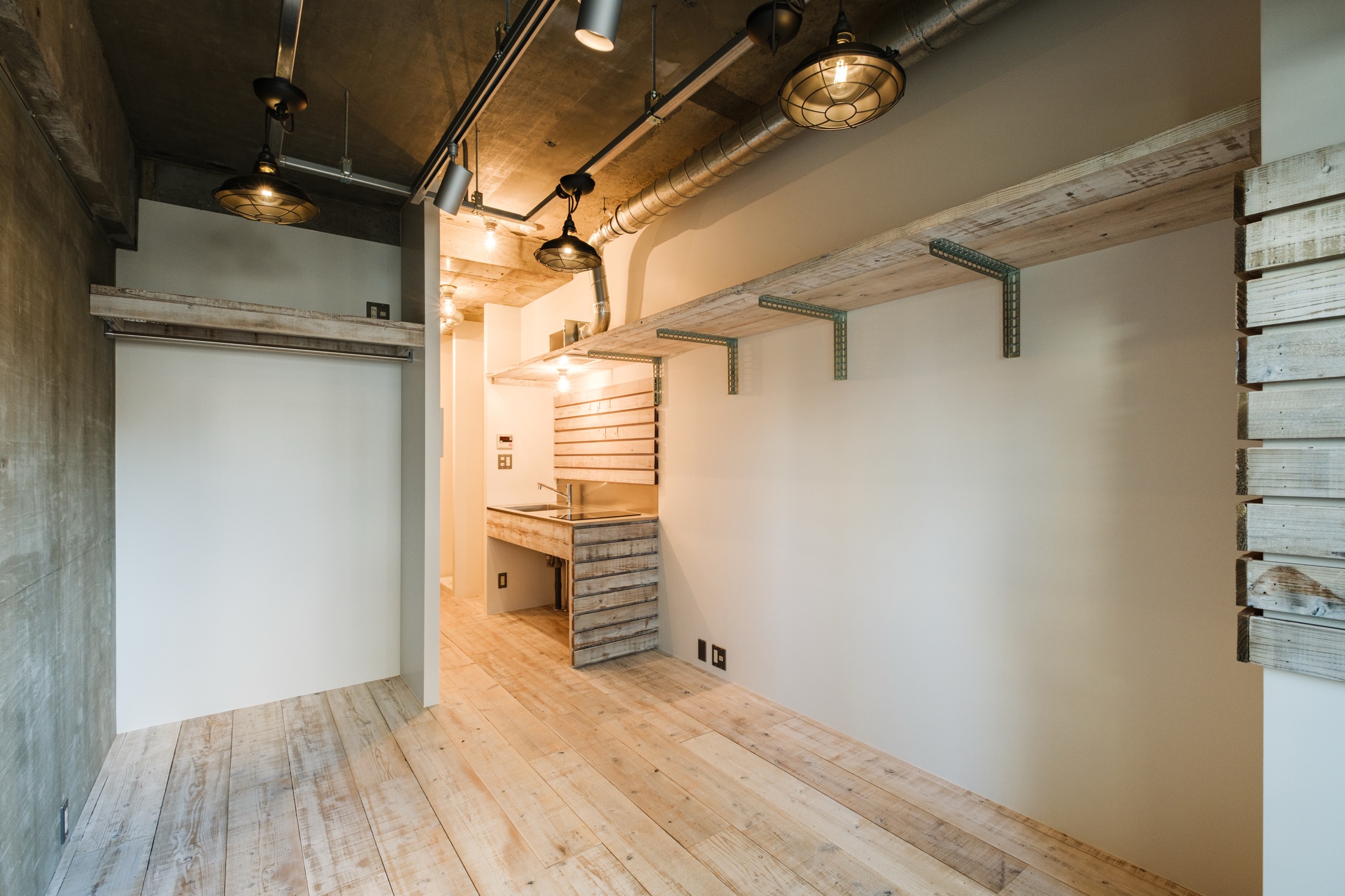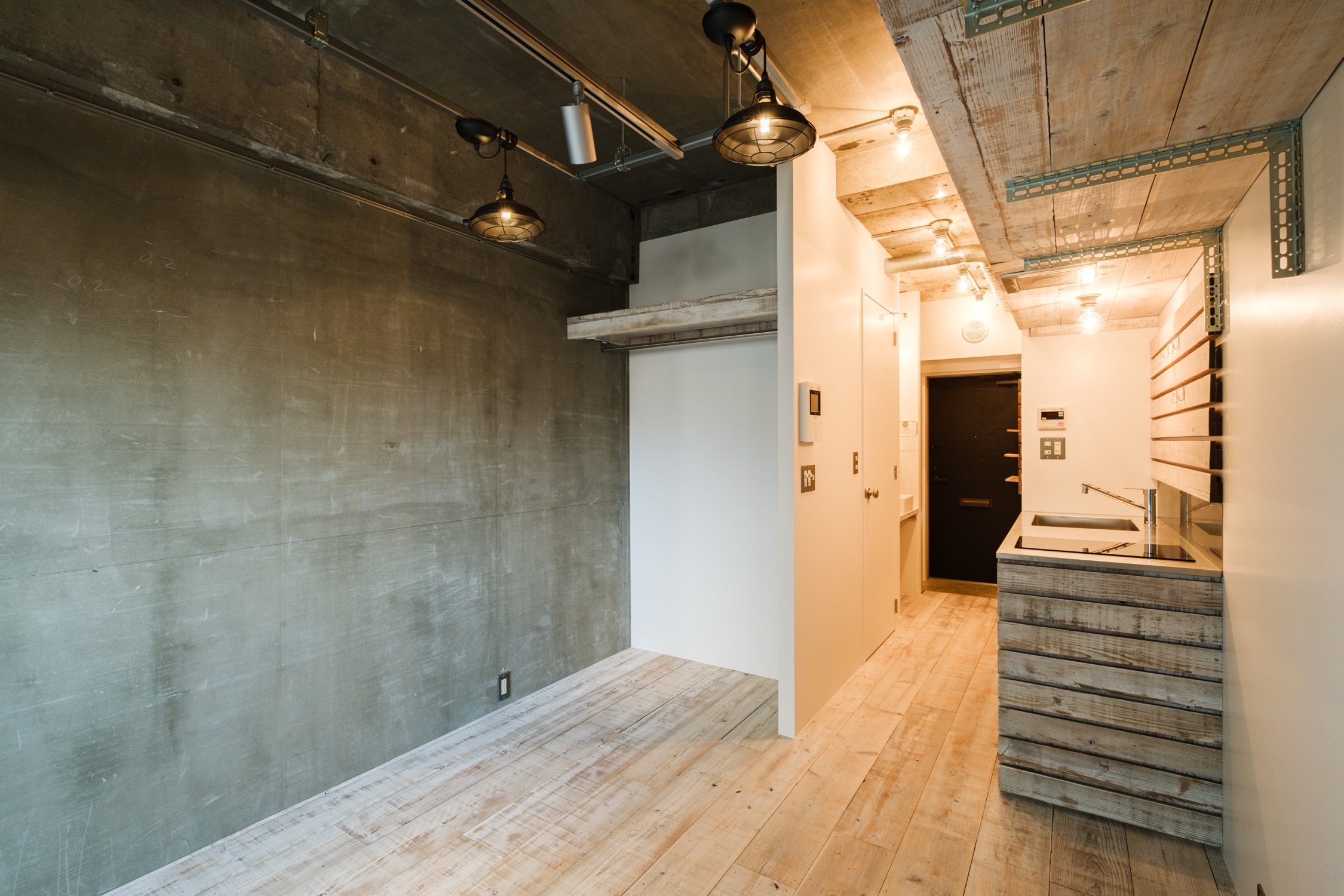 治安が良く素朴な雰囲気漂う街、西巣鴨。落ち着いた環境で暮らしたい方におすすめのエリアに「Garage」シリーズがあります。洗いざらしのような風合いが魅力のフローリングや剥き出しのコンクリート、すのこ状の収納ラックなど無骨な雰囲気が特徴のお部屋です。コンパクトな間取りなので居室を最大限大きく取れるように水回りをプランニング。キッチンと居室も緩やかに区切れるようにプランニングしました。居室上部には大容量の収納棚を設け、オフシーズンのものをや隠したいものなど、ボックス収納に入れてたっぷり収納することができます。天井からはレールを吊り下げ、倉庫風のデザインに。照明は好きな位置に移動はでき、レール用のフックなどを活用すればディスプレイも楽しむことができちゃいます。キッチンには足場板のラフな質感を活かしたすのこ状の収納ラックを設置。S字フックを引っ掛けて自分好みに工夫して活用してみてください。遊び心のある空間で、映画のワンシーンのような暮らしを楽しんで。