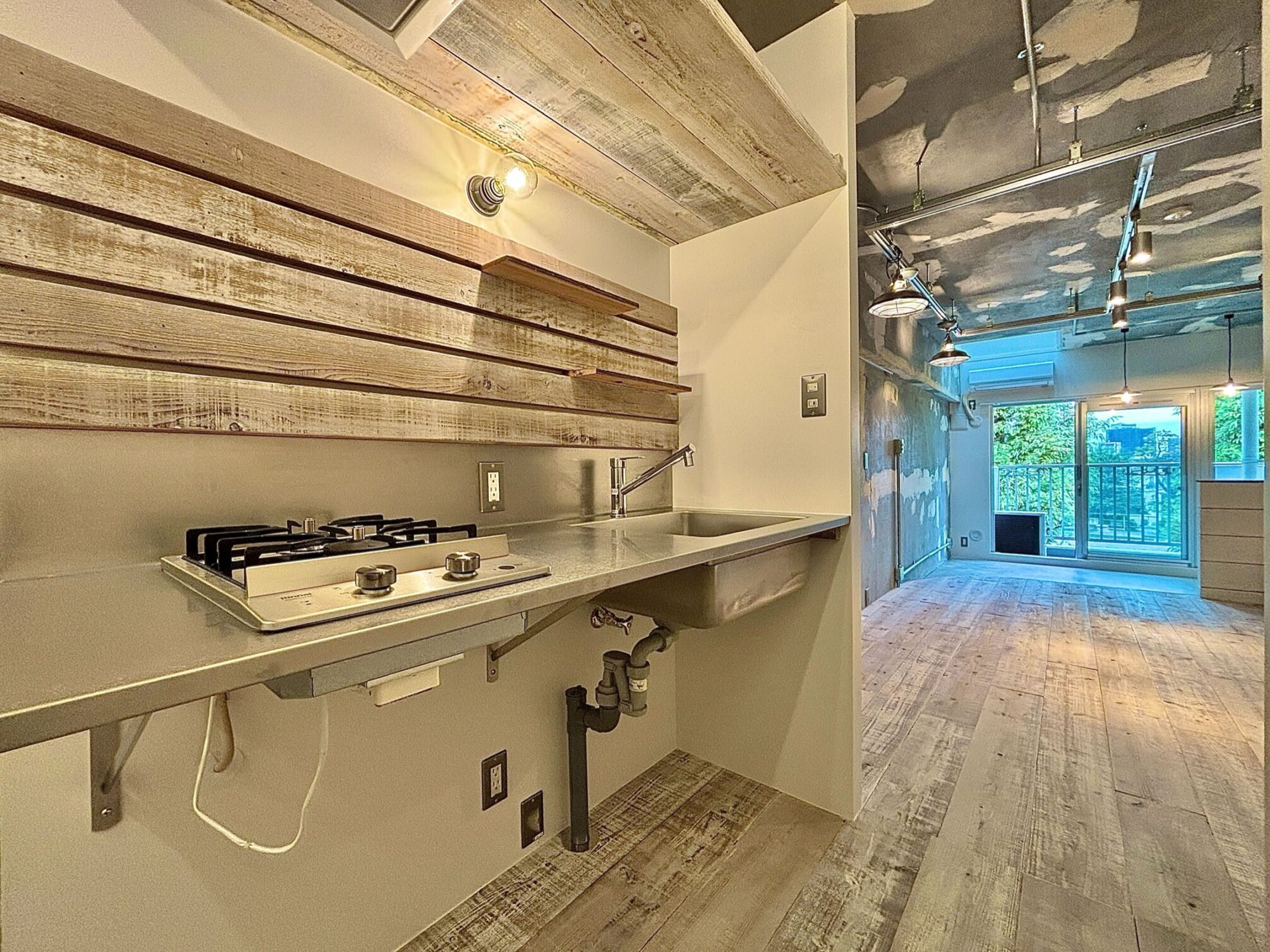 インナーテラス部分にあるペンダントライトは、ドラム缶などの廃材を再利用して作られたもの!お部屋のアクセントになっていてお部屋に遊び心をプラスしています。天窓付きのお部屋は珍しいので、特別感があるのも良いポイントです◎
