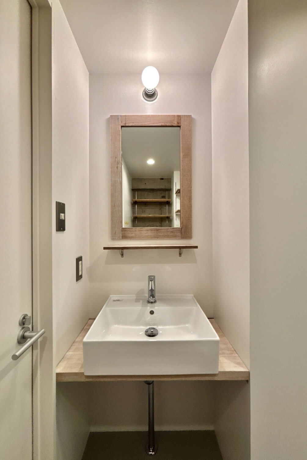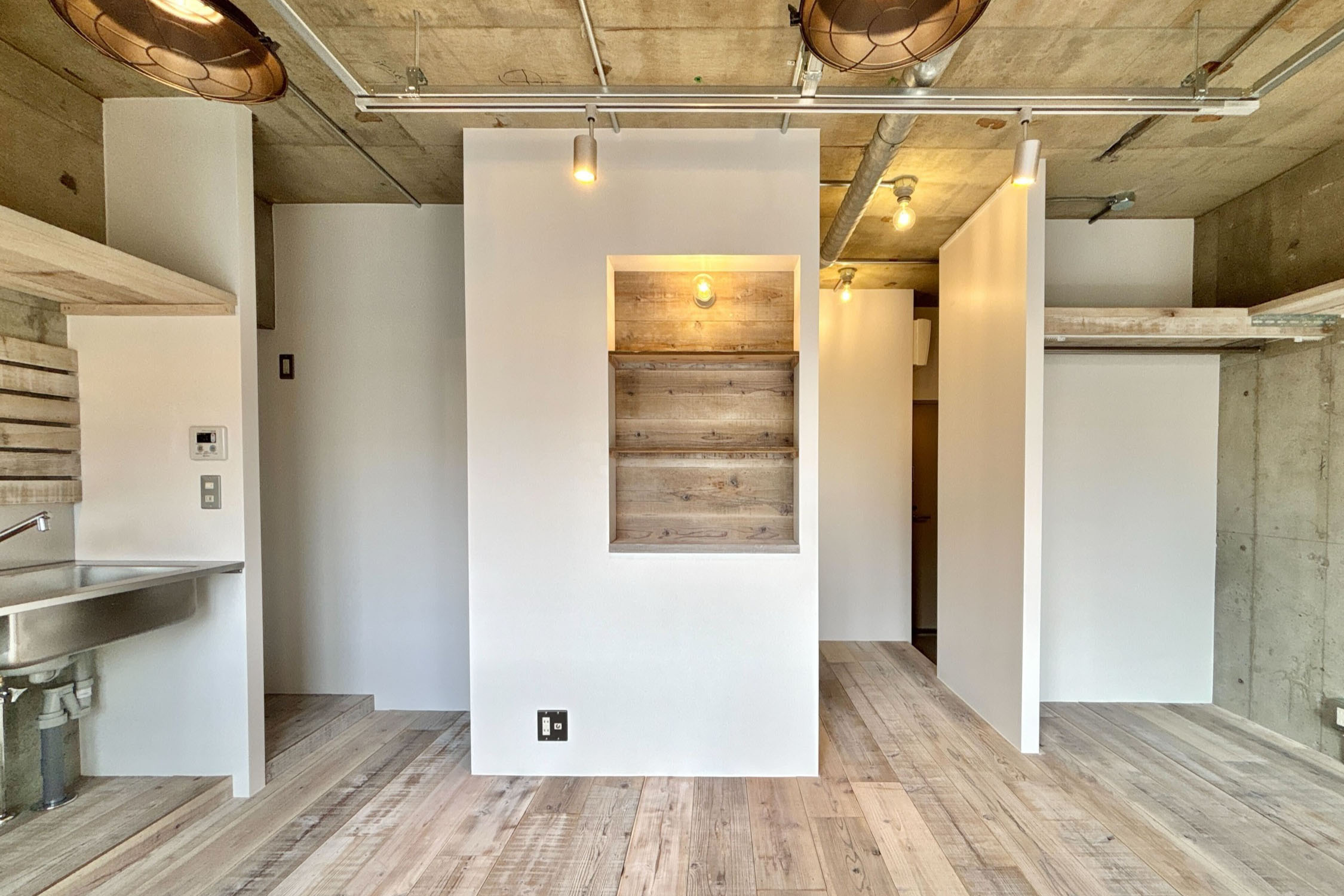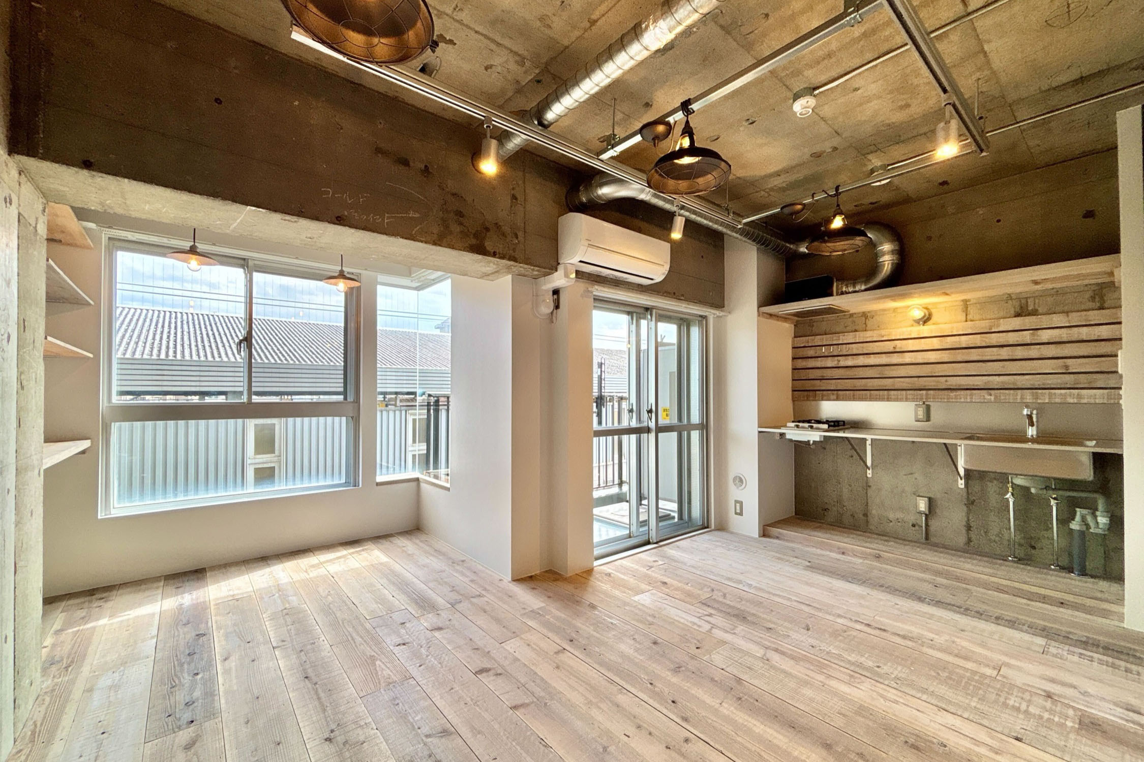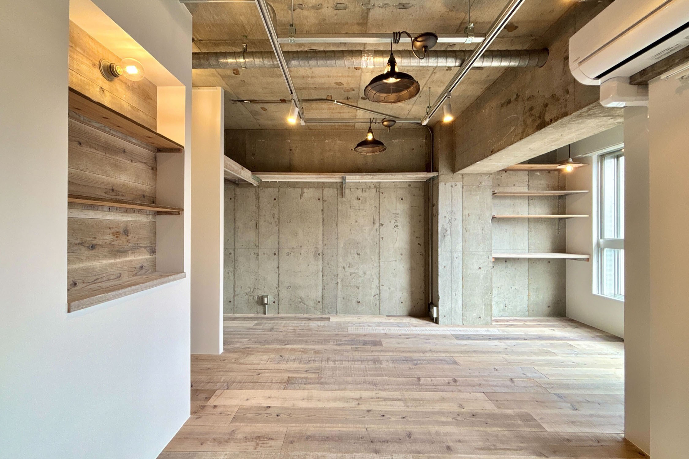 天井は剥き出しのコンクリートと配管がGarageシリーズの雰囲気を作り出しています。インダストリアルな照明器具を設置し、よりその世界観を表現します。荒々しくも洗練されたお部屋に仕上がりそうです。