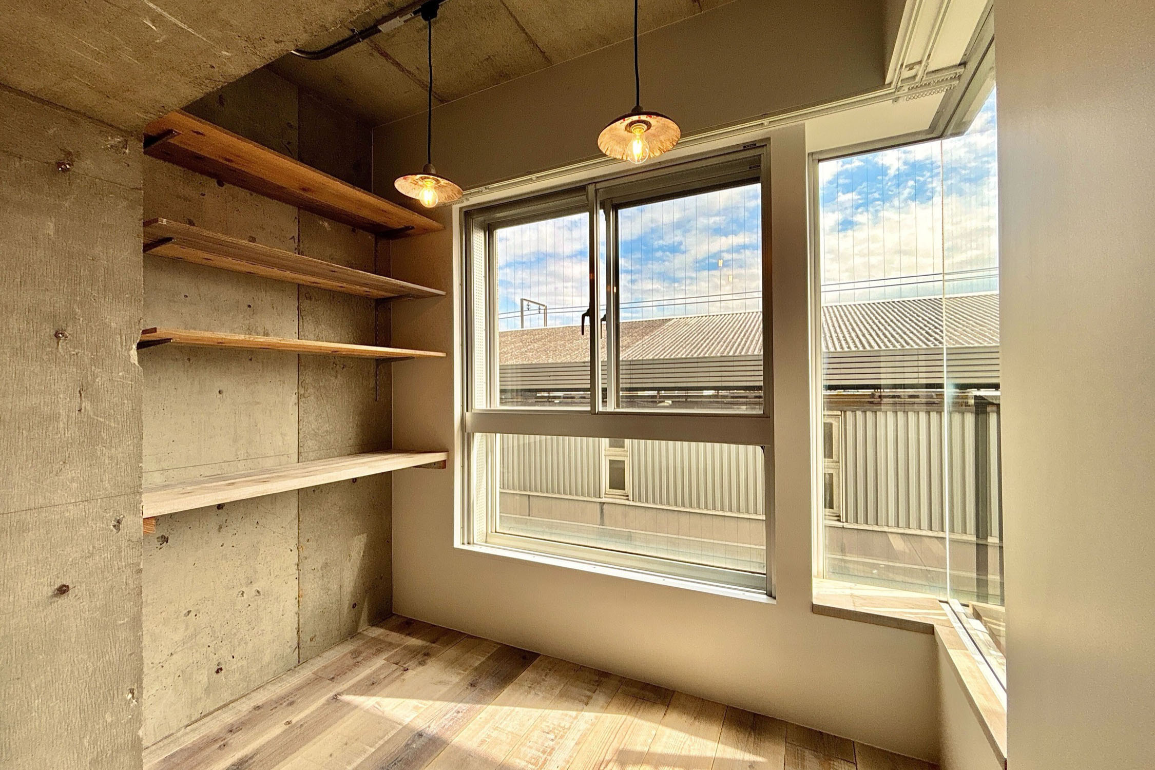 棚がたくさんあるので、洋服や自分の好きなものを飾れます◎ 陽当たりも良く、明るい色の足場板とマッチして明るい印象のお部屋です。