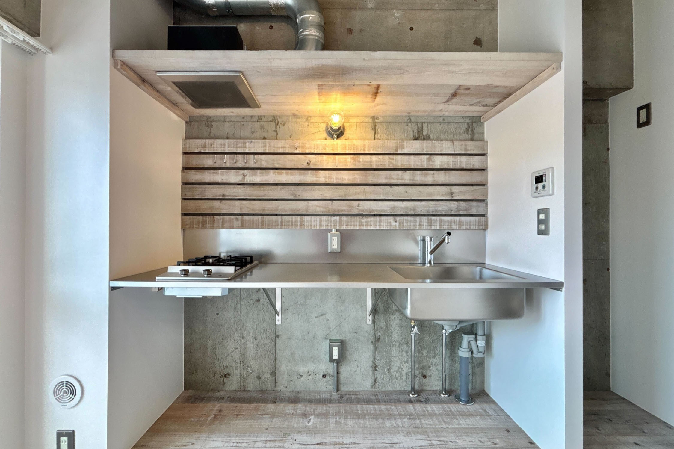キッチンは躯体面に木を貼り合わせたラギッドな雰囲気に。正面にはすのこラックを設置。そこにS字フックなどを使ってキッチン道具やお気に入りのアイテムをかけることで、個性を引き出すスタイルにできます。