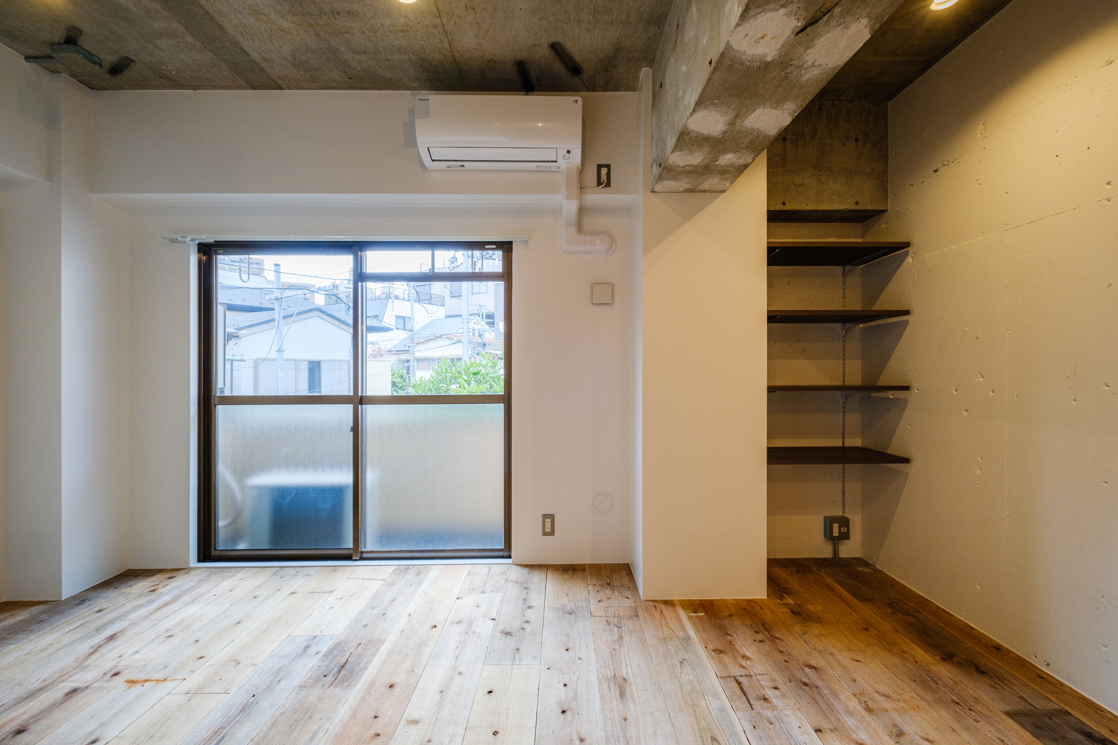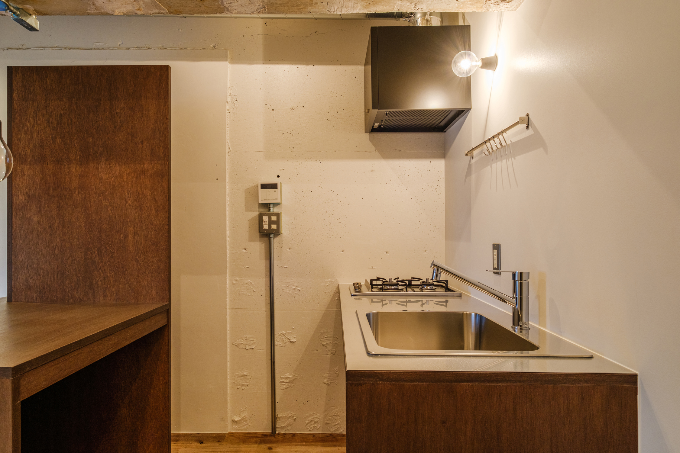 地下鉄から地上に上がるとそびえ立つ高層ビル。「中野坂上」ってこんな感じなんだと意外に思うかもしれない。新宿、渋谷、池袋に出やすく交通の便は文句はない。駅内や駅周辺には、パン屋やコンビニ、カフェやファストフードなどが揃っている。区画整理が綺麗にされた大通りを下れば、大型のスーパーやドラッグストアやファミレスと並ぶ。一本通りを中に入れば静かな住宅街。駅から歩くこと7分ほど、静かに流れる神田川のすぐ近くに「iCafe」はある。板チョコみたいなブラウンのドアを開ければ私専用のカフェカウンターがお出迎え。セパレートタイプのキッチンは作業のしやすさはもちろん、ダイニングやデスクとしても使える。大きな裸電球が暖かな色で照らす、その下で何をしよう。ワイドな足場板の床材は、長く使い込まれた風合いが残っていて、ところどころにペンキや印字のあとに愛着を感じる。居室の窓からは緑が見え、自然光が入ってくる。好きなものを揃えて、持ってきて…きっと、この部屋に帰ってくる度に、このカフェカウンター越しの生活を愛おしく思うだろう。