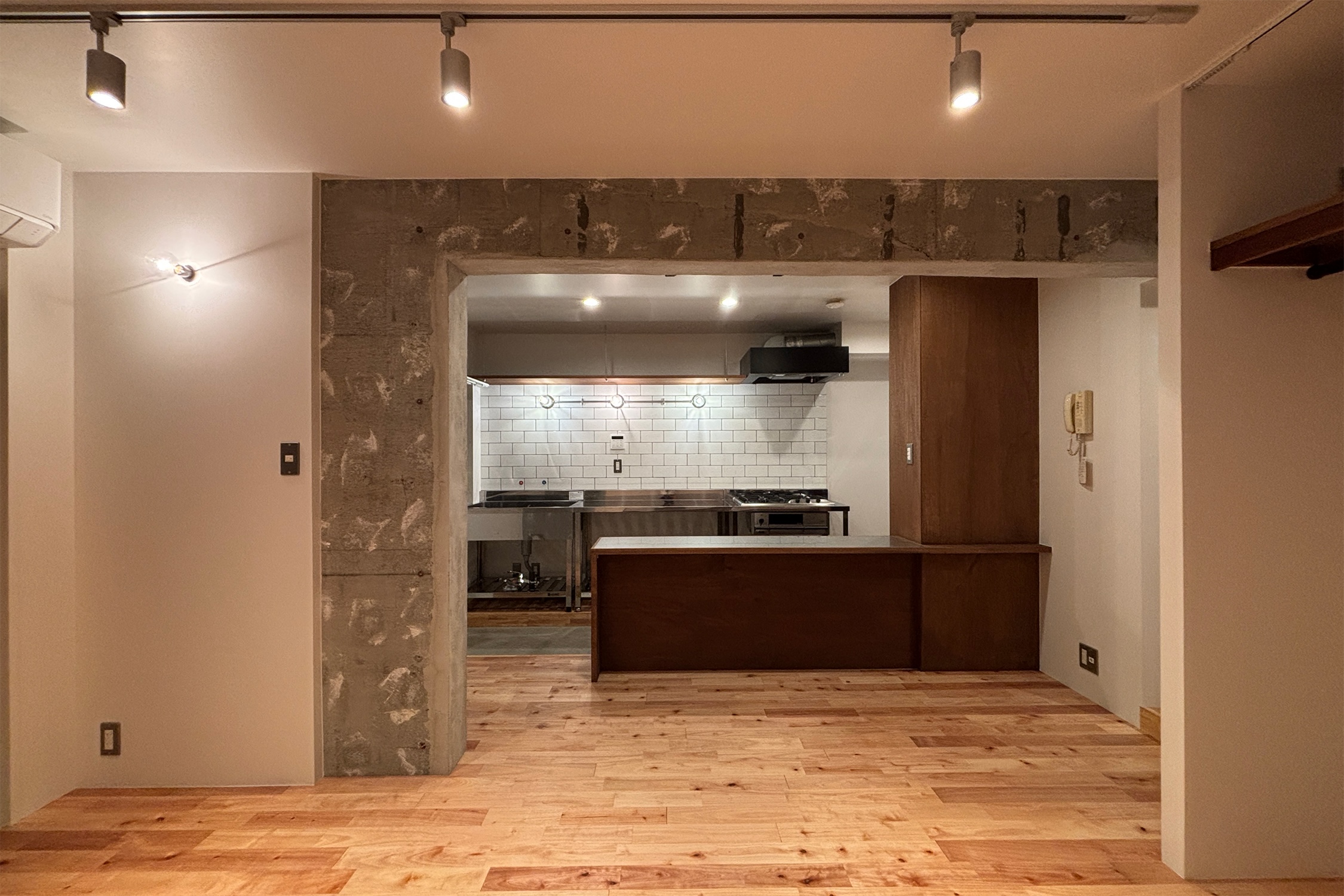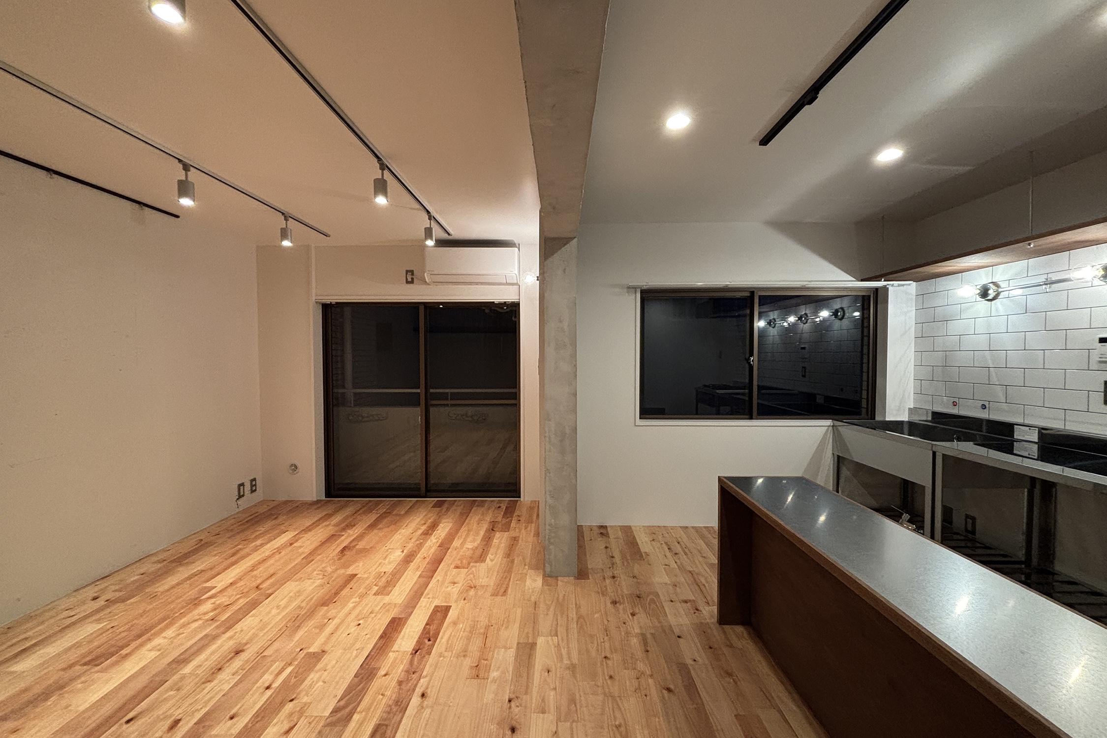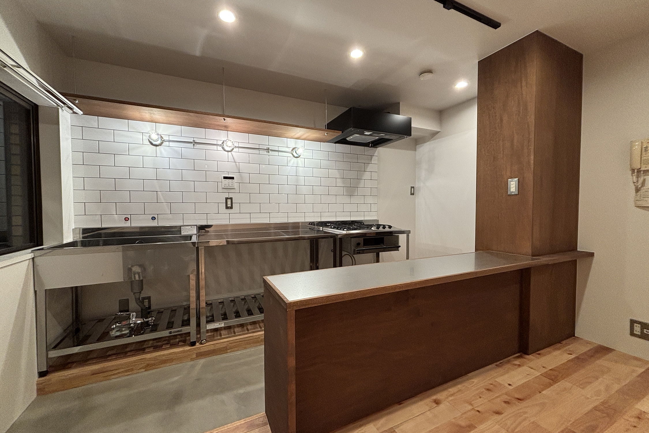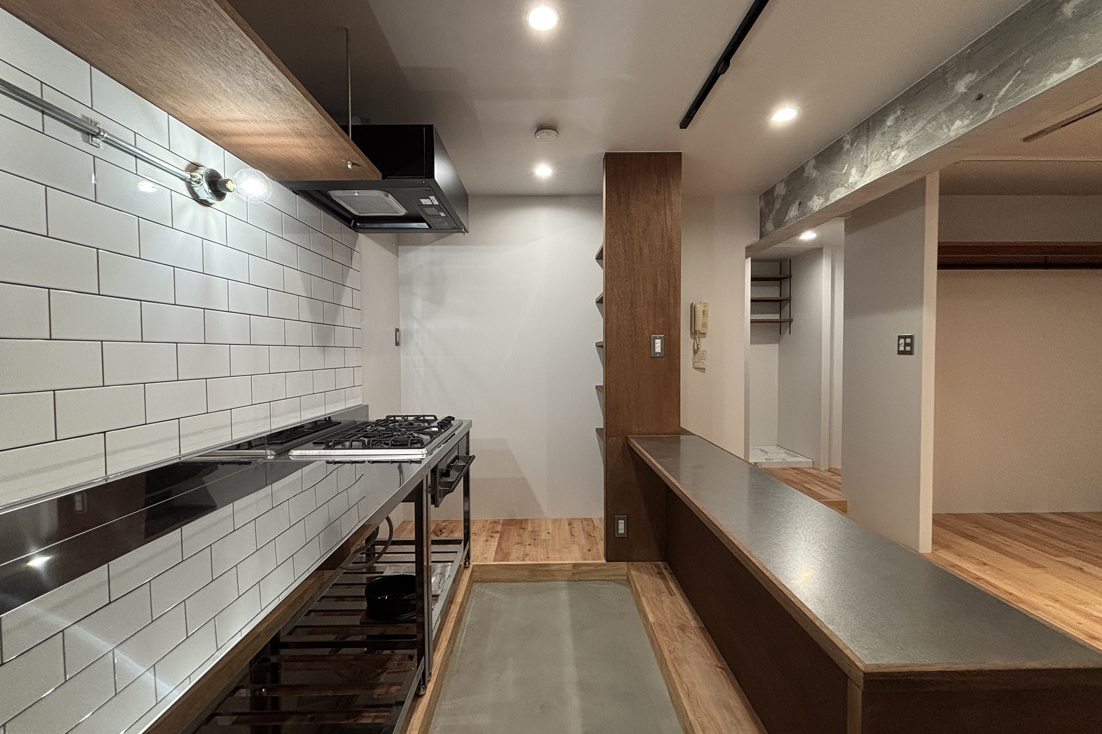 西武新宿線が通る「沼袋」駅。駅南側に「平和の森公園」があり、緑豊かな景色が広がっている。駅前は個人経営の飲食店も多く、住めば住むほど味わいや住み心地の良さを感じる。そんな沼袋の街に、リノベーションシリーズ「Kitchen」の部屋があります。広々とした玄関スペース。そこを抜けると正面に水回りがまとまっています。お風呂場にも小窓が付いているのが嬉しいポイント。さらに進むと右手にはワンルームとは思えないほどのキッチンスペース、左手には居室が広がっています。飲食店のような大きなシンクと作業スペースに3口コンロ、さらにはカウンターテーブルまであり、まるでライブ感のあるビストロのような雰囲気。窓から光が差し込む明るいキッチンに、弾んだ声が響く様子が目に浮かびます。居室空間は梁と構造壁でゾーニングされ、暮らしの動線も明確になっています。キッチンが中心のお部屋で、家族や友人を招いて料理を振る舞う。そんな生活がこの部屋にはあります。