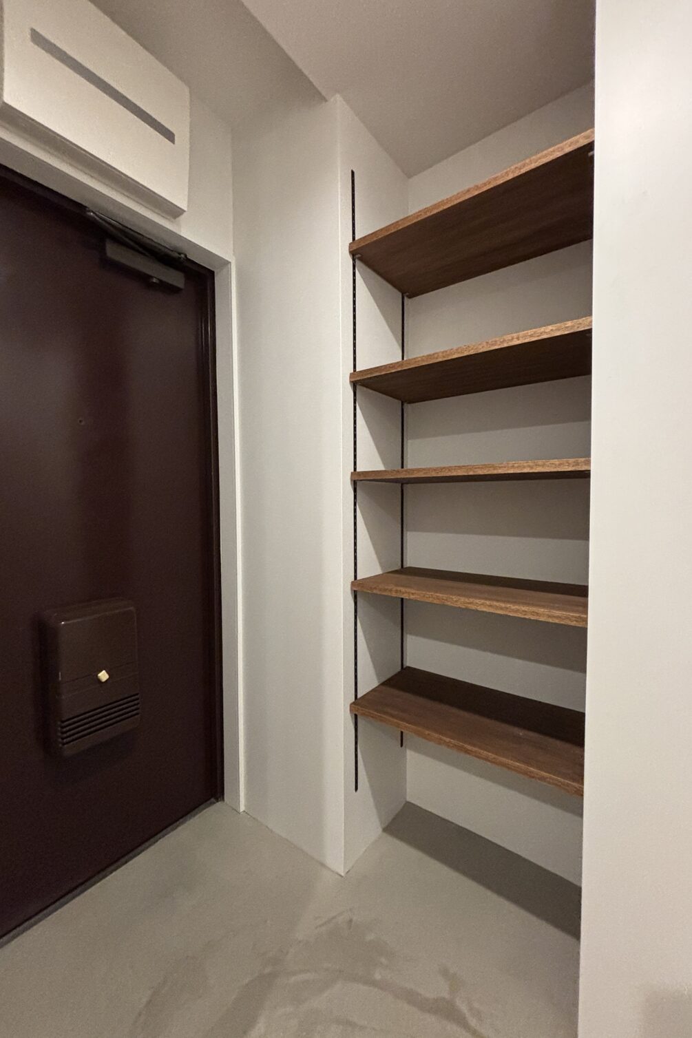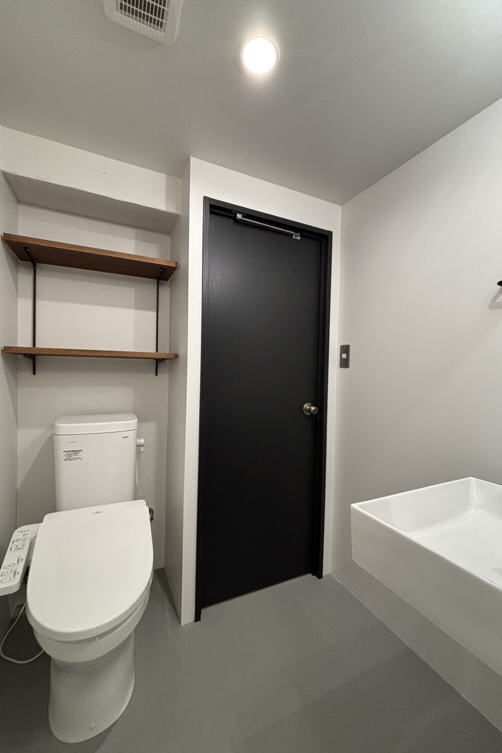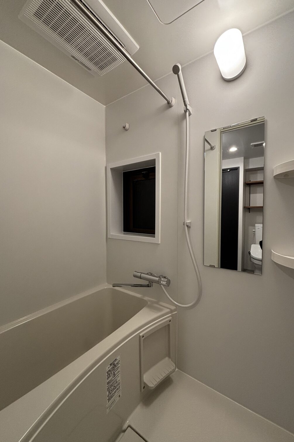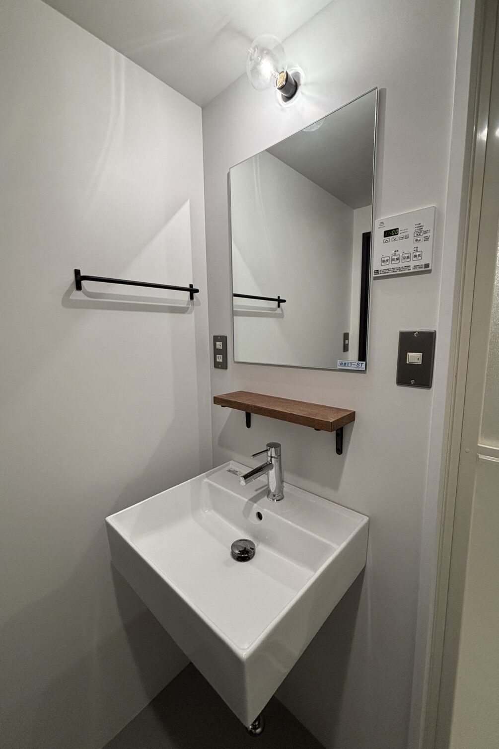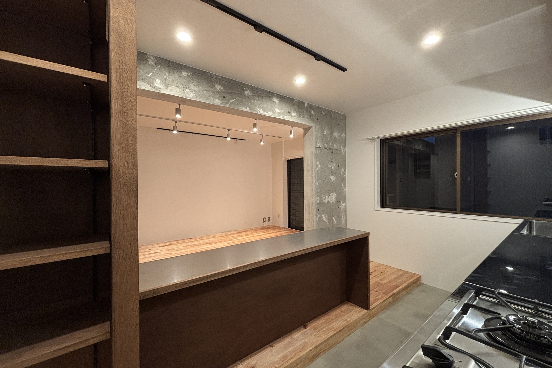 西武新宿線が通る「沼袋」駅。駅南側に「平和の森公園」があり、緑豊かな景色が広がっている。駅前は個人経営の飲食店も多く、住めば住むほど味わいや住み心地の良さを感じる。そんな沼袋の街に、リノベーションシリーズ「Kitchen」の部屋があります。広々とした玄関スペース。そこを抜けると正面に水回りがまとまっています。お風呂場にも小窓が付いているのが嬉しいポイント。さらに進むと右手にはワンルームとは思えないほどのキッチンスペース、左手には居室が広がっています。飲食店のような大きなシンクと作業スペースに3口コンロ、さらにはカウンターテーブルまであり、まるでライブ感のあるビストロのような雰囲気。窓から光が差し込む明るいキッチンに、弾んだ声が響く様子が目に浮かびます。居室空間は梁と構造壁でゾーニングされ、暮らしの動線も明確になっています。キッチンが中心のお部屋で、家族や友人を招いて料理を振る舞う。そんな生活がこの部屋にはあります。