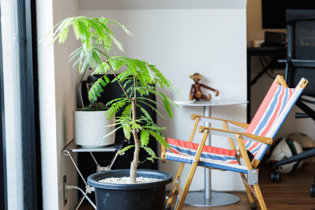 「この部屋は昼過ぎから日の入りまで陽当りが良いので、緑が良く育つんです。窓際に置いているエバーフレッシュは、育ちすぎるので何度も剪定したくらいで(笑)。この場所に椅子を置いて夕暮れを眺めていると、時間が経つのを忘れてしまうんです。それくらい、気持ちの良い陽が入る場所なんですよ」