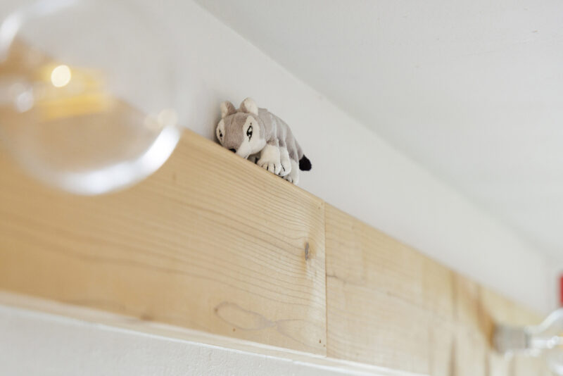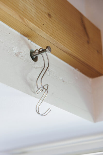 (左)「この部屋はPコン穴があるので、ボルトを挿入して色々活用できるのも良いんですよね」設置したボルトに何気なく引っかけたS字フックが、ちょっとしたインテリアに。(右上)杉板には、物を挟んで固定する際に使用するクランプが。「壁に穴を開けられないので、クランプを使って物を引っかけたりしています。このクランプが良い仕事をするんですよ(笑)」(右下)杉板の上にちょこんと置かれたソフトトイ。部屋の上部にもIさんのアイデアが満載。