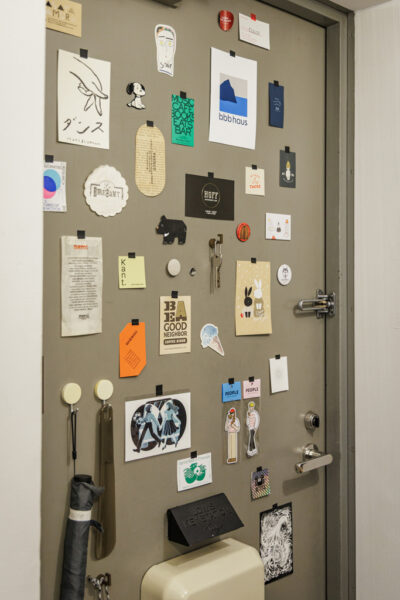 ガラス戸には自身がデザインしたアイテムをさりげなく飾り、閉めた先の白壁と一体となってアートの一部となっている。