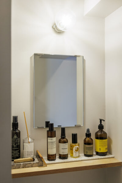 (左)実はIさん、デザイナーの仕事とともにカメラマンとしての一面を持つマルチな才能の持ち主。「バレエコンクールの写真を撮影させていただくこともあります」デスク横に置かれたスタンドライトは、撮影用の機材を使用しているという。お洒落でありながら実用性を兼ねた使い方は、ぜひ参考にしたい。(右)お気に入りのアイテムが並べられた気持ちの良い洗面所。使い勝手もさることながら、招いた人を癒しで包む香りの演出も流石。