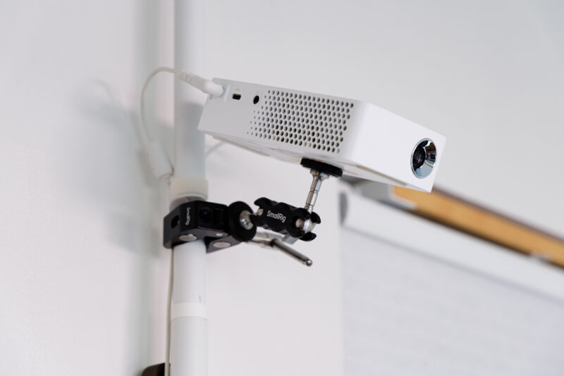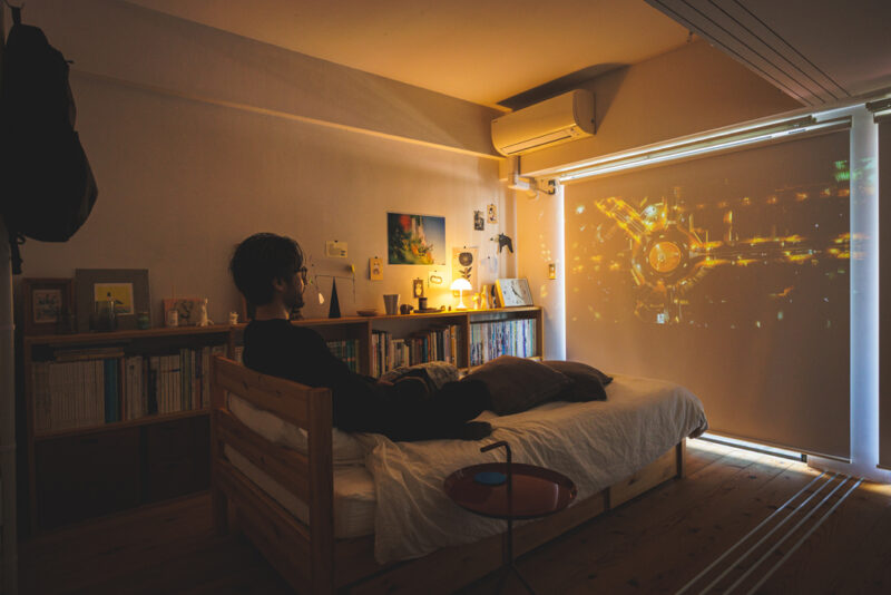 クローゼット横に突っ張り棒を立て、そこにプロジェクターを設置。窓にはロールスクリーンを吊るし、ベッド兼ソファで映画を観るのが日課になっているという。