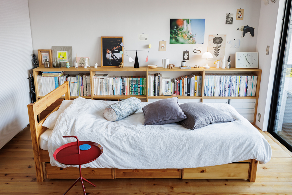 「ベッドを部屋の真ん中に置いているんです。びっくりしますよね(笑)。壁際に置いたり、窓の横に置いてみたりと色々やってみたんですけど、今はこれが一番しっくりきて。驚かれるんですけど、意外と使い勝手がいいんです」