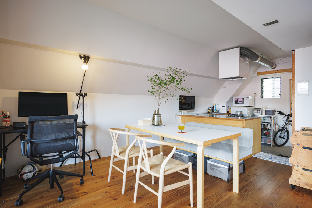 楽しそうに語るIさん。ダイニングテーブルの横には、シンプルにまとめられた仕事用のデスクが。