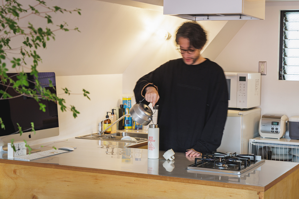 「色々と調理道具はあるんですけどまったく料理をしなくて。外食することが多いので、することといったらお湯を沸かしてボトルに入れるくらいですかね(笑)。キッチン下は土間になっているので、キャンプ道具の収納場所となっています」