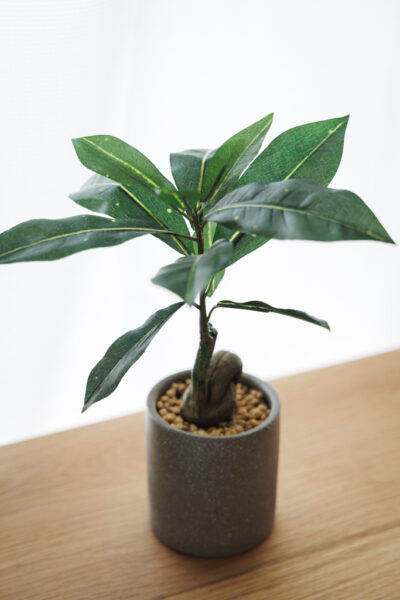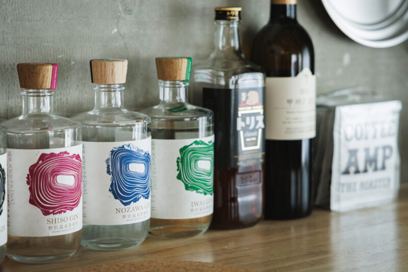 (左)Iさんの住む部屋を見回すと、所々にグリーンが彩を添えている。「置いている植物はすべてフェイクなんです。この部屋は陽当りが良いので植物は良く育つと思うんですけど(笑)」(右上)家ではあまりお酒を飲まないというIさん。同僚に美味しいと勧められたジンにハマり、たまに飲んでいるそう。(右下)作業台にはウィスキーのほかに、お勧めされたというジンが並ぶ。「このジンは色々な味があるので、その日の気分で飲み分けています」キッチンの落ち着いた色味の中に、彩り豊かなジンのパッケージが良いアクセントに。
