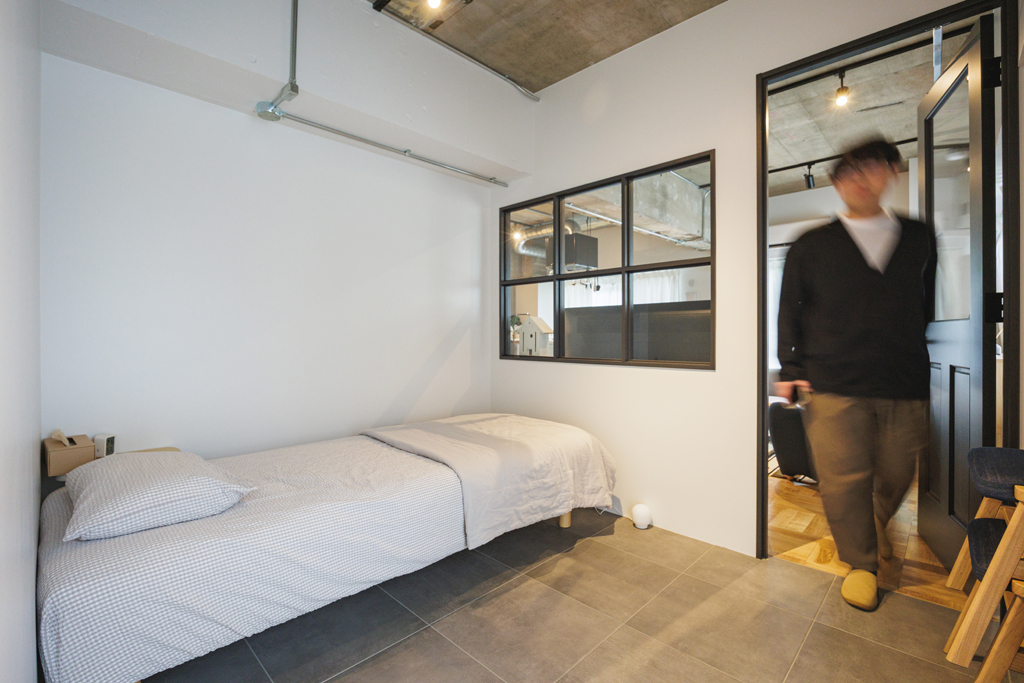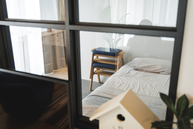 「ドアで仕切られているだけじゃなく、床自体にメリハリがついているので、すっと気持ちが切り替えられるんです。寝室にもエアコンがついているので、常に快適にいられるのもありがたくて。ドアにはガラスが入っていてリビングも見えるし、窓がついているので圧迫感がないのも良いですね」
