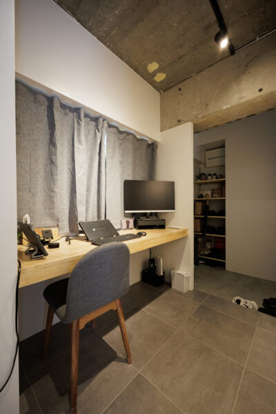 窓には薄いグレーのカーテンを取り付け、作業台下には色味を揃えた椅子を設置。シックにまとめられ、仕事に使用する以外のものは置いていない。たしかに落ち着いて仕事ができそうだ。