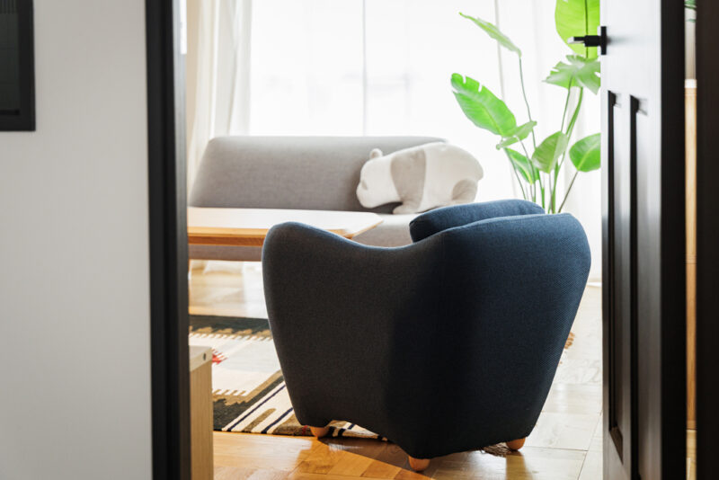 広々としたリビングには、無印で購入した2シーターのソファに、ネイビーが鮮やかな一人掛けのミニマムチェア。REISM SELECTで手に入れたという、アースカラーの落ち着いた色味のキリムラグ。人数が多いときには、寝室に置いているスタッキングチェアを出しておもてなしをするという。