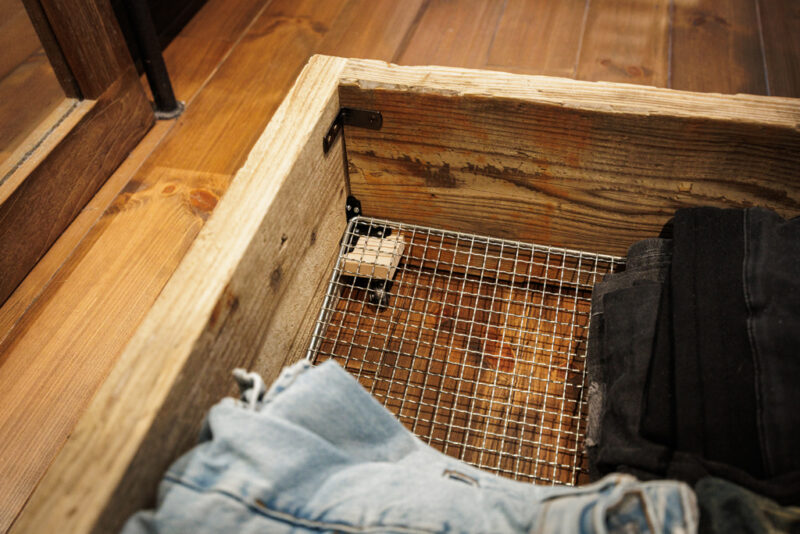 きれいに並べられたデニムを横にずらしてもらうと、バーベキュー網が。定型通りではなく、いかに自分が心地よく暮らせるかを考え、それをカタチにしたのだという。