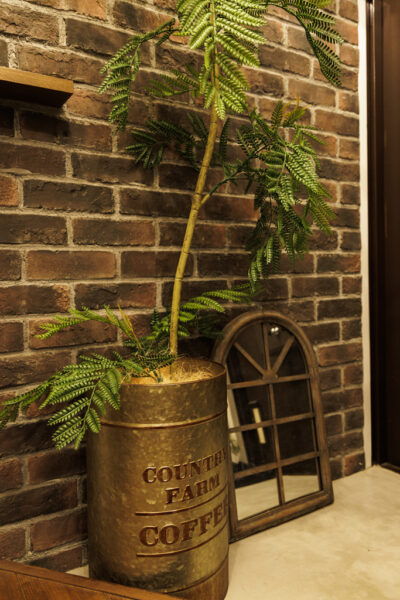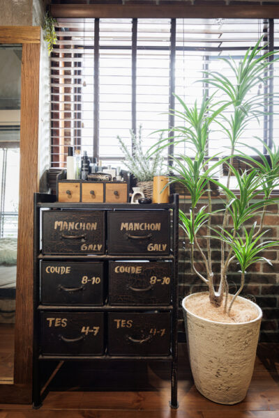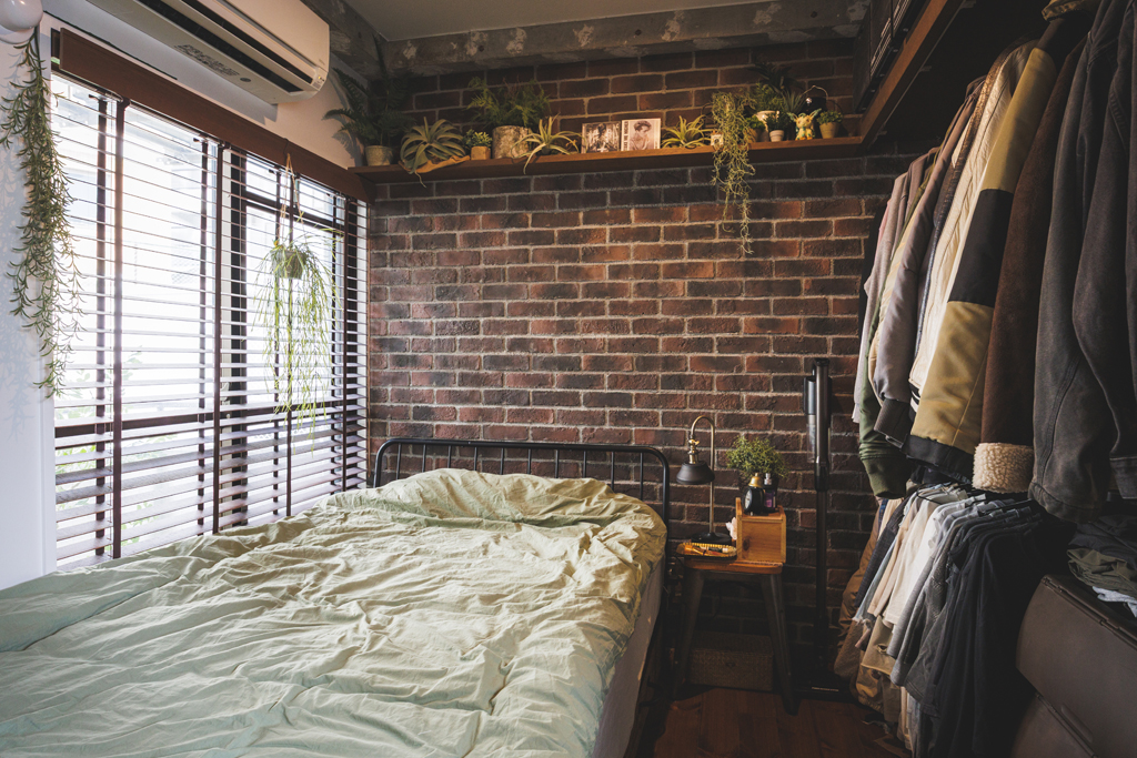 「インテリアには人一倍こだわりがあって。前に住んでいた部屋もかなり作りこんで、インテリアサイトの賞をもらったこともあるんですよ。この部屋は、ヴィンテージ感のあるレンガに合わせて、アイアンを使った家具やレザー製品、植物や木製のアイテムで統一感をもたせました。でも、自分の中ではまだ完成形じゃなくて。ブラインドを変えれば100点なんですけどね(笑)」