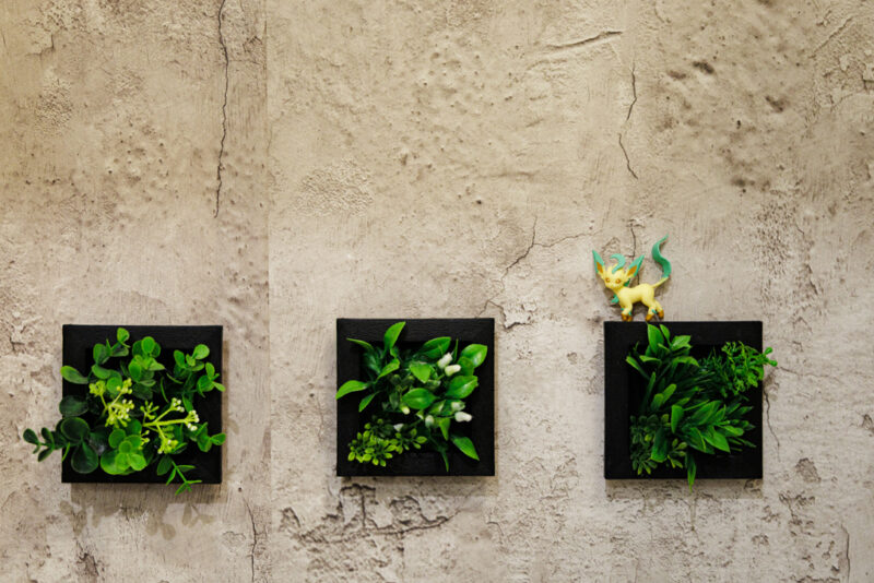 レンガ壁には備え付けの棚が設置されており、そこには多種多様の植物とCDが。右端までくまなく眺めていると、こちらを見つめように置かれたリーフィアを発見!
