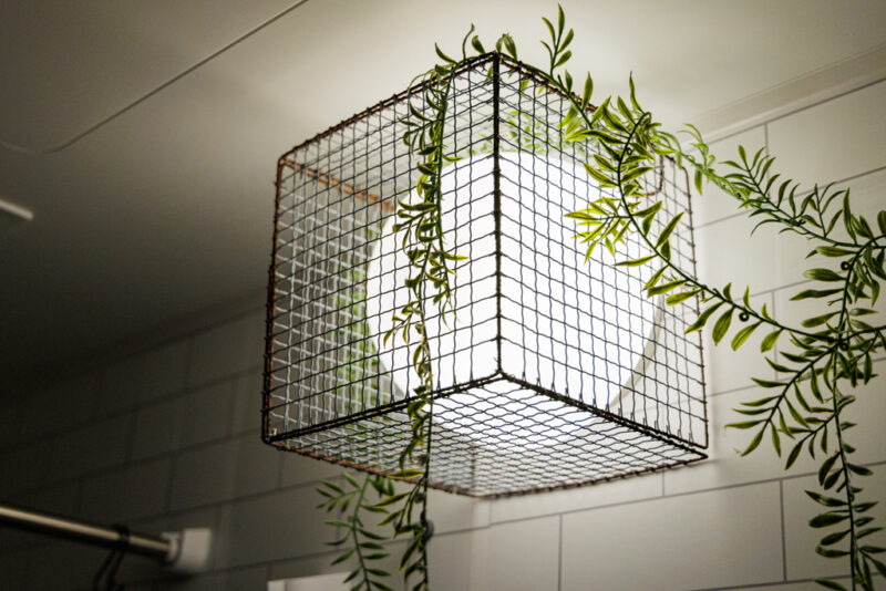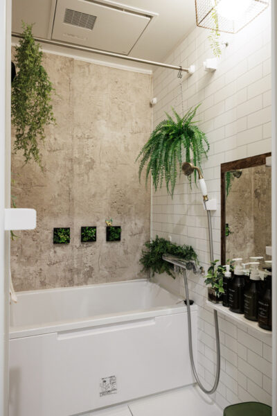 「お風呂場の壁は防水タイプの壁紙を貼ったんです。ホワイトタイルがプリントされた壁紙と、土壁っぽい壁紙を貼って変化を持たせました。シャワーヘッドもアンティーク調のものに変えて、照明にはアイアンを被せて部屋との統一感を出しました。あ、でも穴とかは開けてないですよ。原状回復できるDIYなんで心配ないです!」