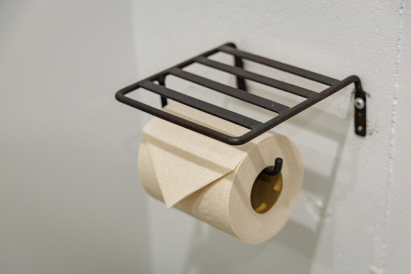 「洗面所も緑をふんだんに使って居心地の良い空間にしたくて。トイレットペーパーホルダーも部屋の雰囲気に合わせてアイアンに変えました。トイレットペーパーも茶系のものにして統一感が出るようにしたんです」