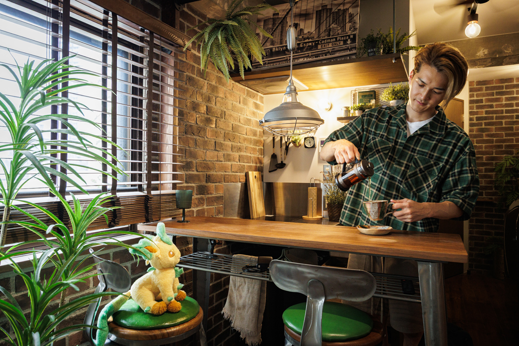 キッチンの向かいに置かれたテーブルをカウンターのように使いハイスツールを2脚置いて、天井からはペンダントライトが吊るされている。空間と相まってまるでカフェのよう。スツールの上には、客人をもてなすようにリーフィアがちょこんと腰かけていた。