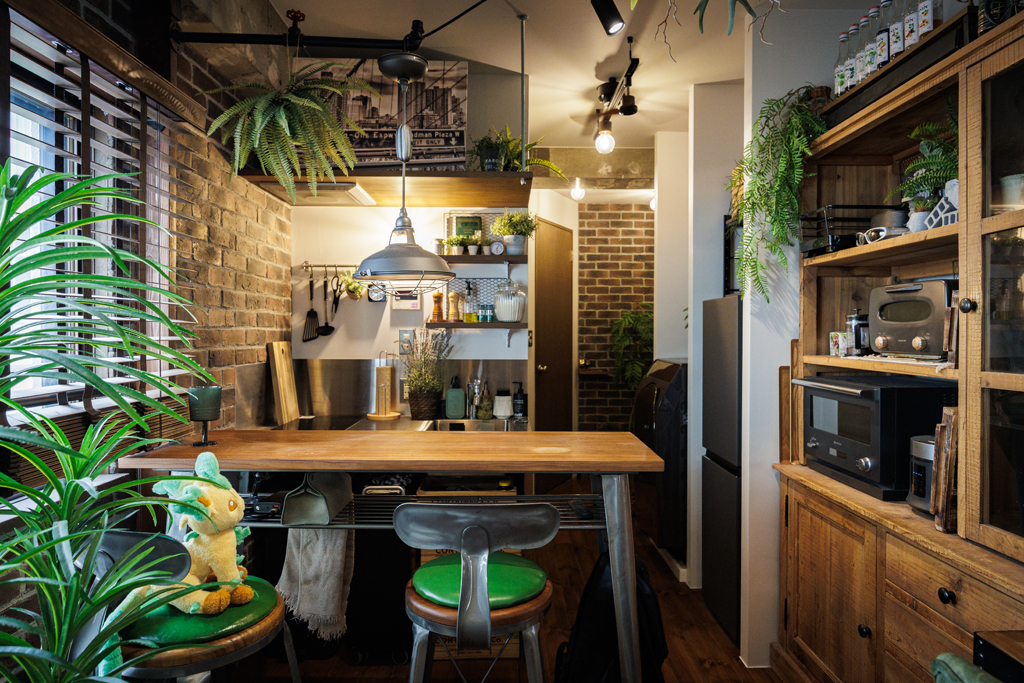 Tさんが住むのは、ヴィンテージライクな赤茶色のタイルに素材の質感を活かしたコンクリートあらわし、無垢材のフローリングが施されたリノベーションシリーズ「Brick」。工業的で無機質な雰囲気はそのままに、部屋中を彩る観葉植物の温かみがバランスよく調和され、何とも心地が良い。