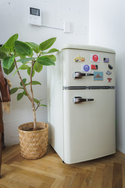 (左)IHコンロのまわりには、紅茶をはじめセンスの良いカトラリーが並ぶ。「海外のアンティーク食器のほかに、和食器も好きで集めています。この部屋にはあまり合わないので、使うときだけ出しています」(右)レトロ感のある冷蔵庫には、旅行先で買ったというマグネットが。扉を開けるたびに旅先での思い出が蘇りそう。