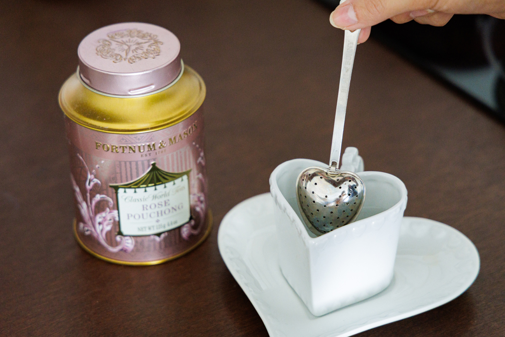 ハート形のカップとソーサーを用意し、ハート型のティーストレーナーにお気に入りの茶葉を入れたMさん。じんわりと茶葉が染み出し、ローズの華やかな香りが部屋いっぱいに広がってきた。