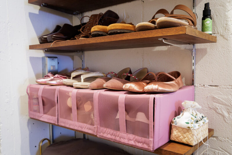 玄関を入ってすぐ大きめのオープンラックがあり、そこにはたくさんの洋服がかかっている。ラックの中央には、主役とばかりにピンクの服が。