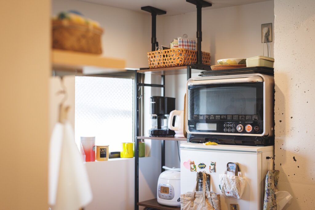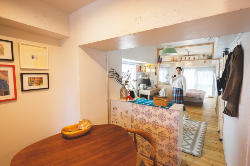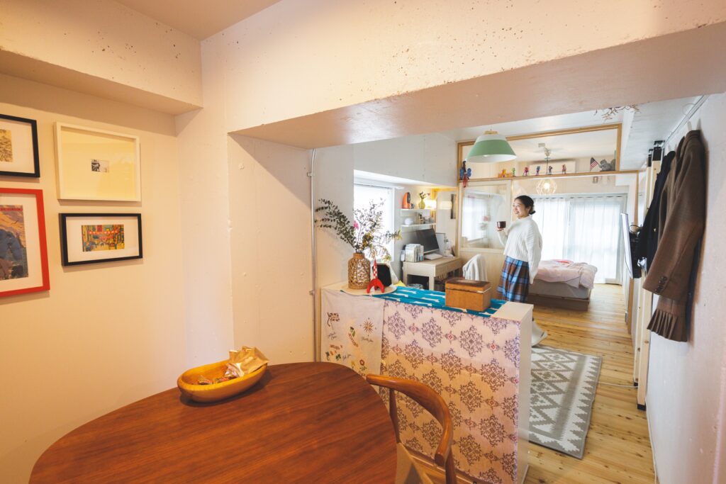 「このテーブルスペース、結構気に入ってて友達呼んでご飯作ったりします。この広さ、ちょうどいいんですよね。詰め込みすぎず、でもちゃんと集まれる感じで。やっぱりこの棚があるのが仕切りとして機能していてちょうどいいのかな?」