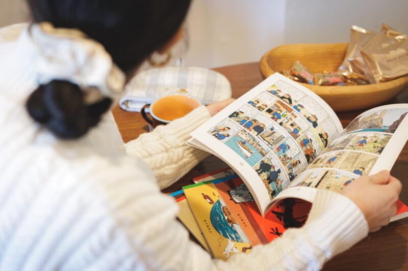 ▲丁寧に本棚に保管しているタンタンの本誌。様々なシリーズがありタンタンが見る世界各国の様子や冒険が描かれる。幼少期からこれを読み本の中で世界中を旅していたと彼女は言う