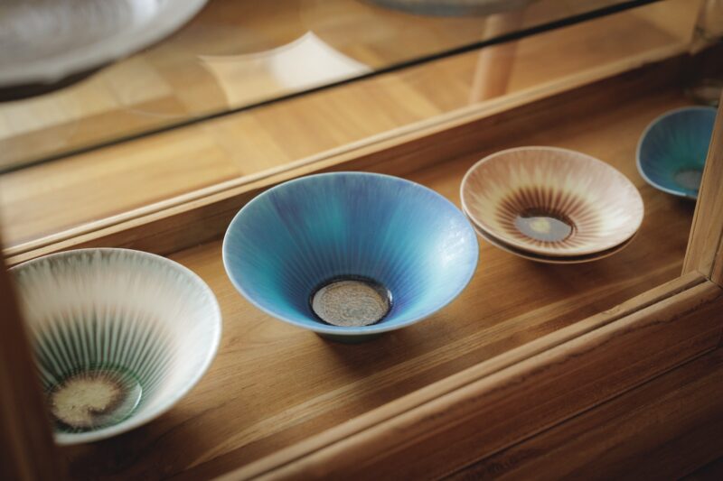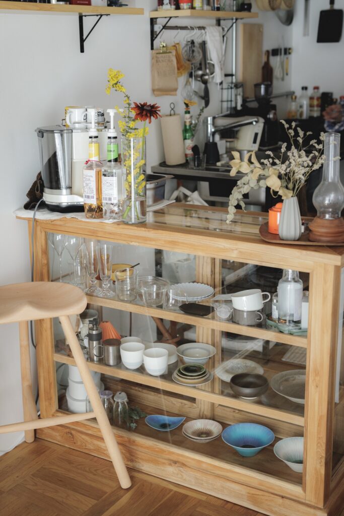 ガラスの食器棚に並ぶ器たちは、それぞれが異なる背景を持ちながら、不思議と調和している。